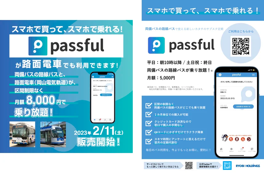 「passful」は、地域社会資本のDXプロジェクトとして、両備グループの両備ホールディングス株式会社(本社:岡山県岡山市北区下石井、代表取締役社長:松田敏之)と株式会社両備システムズ(本社:岡山県岡山市北区下石井、代表取締役社長:松田敏之)が、株式会社ispec(本社:東京都品川区西五反田、代表取締役社長:島野耕平)と共同で開発した、両備バスの路線バス+岡山電気軌道の路面電車で利用可能なデジタル定期券アプリです。
