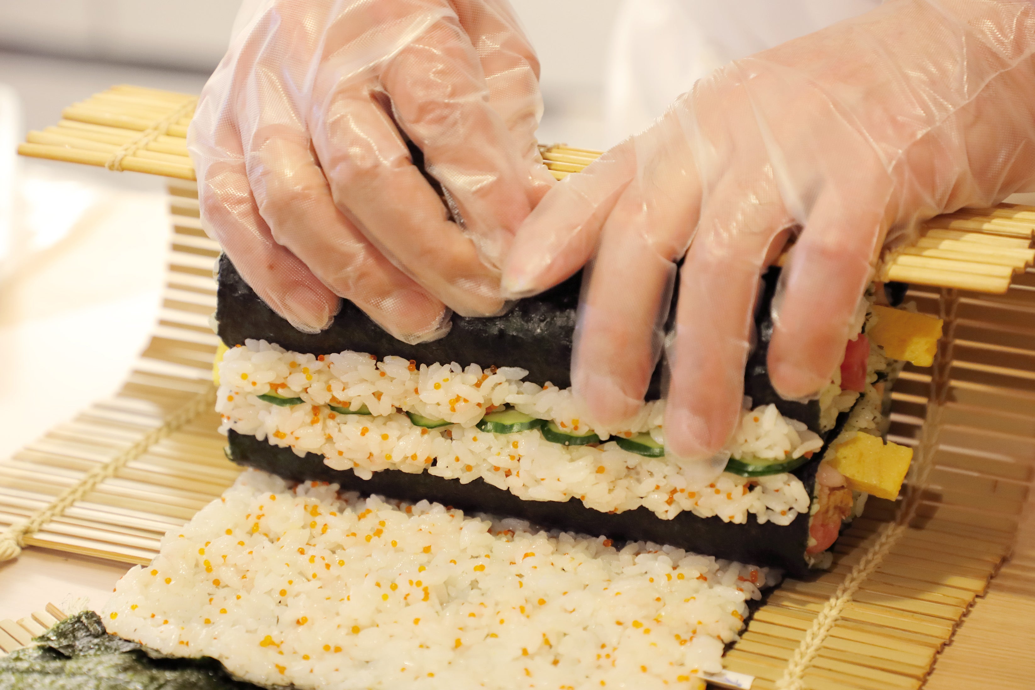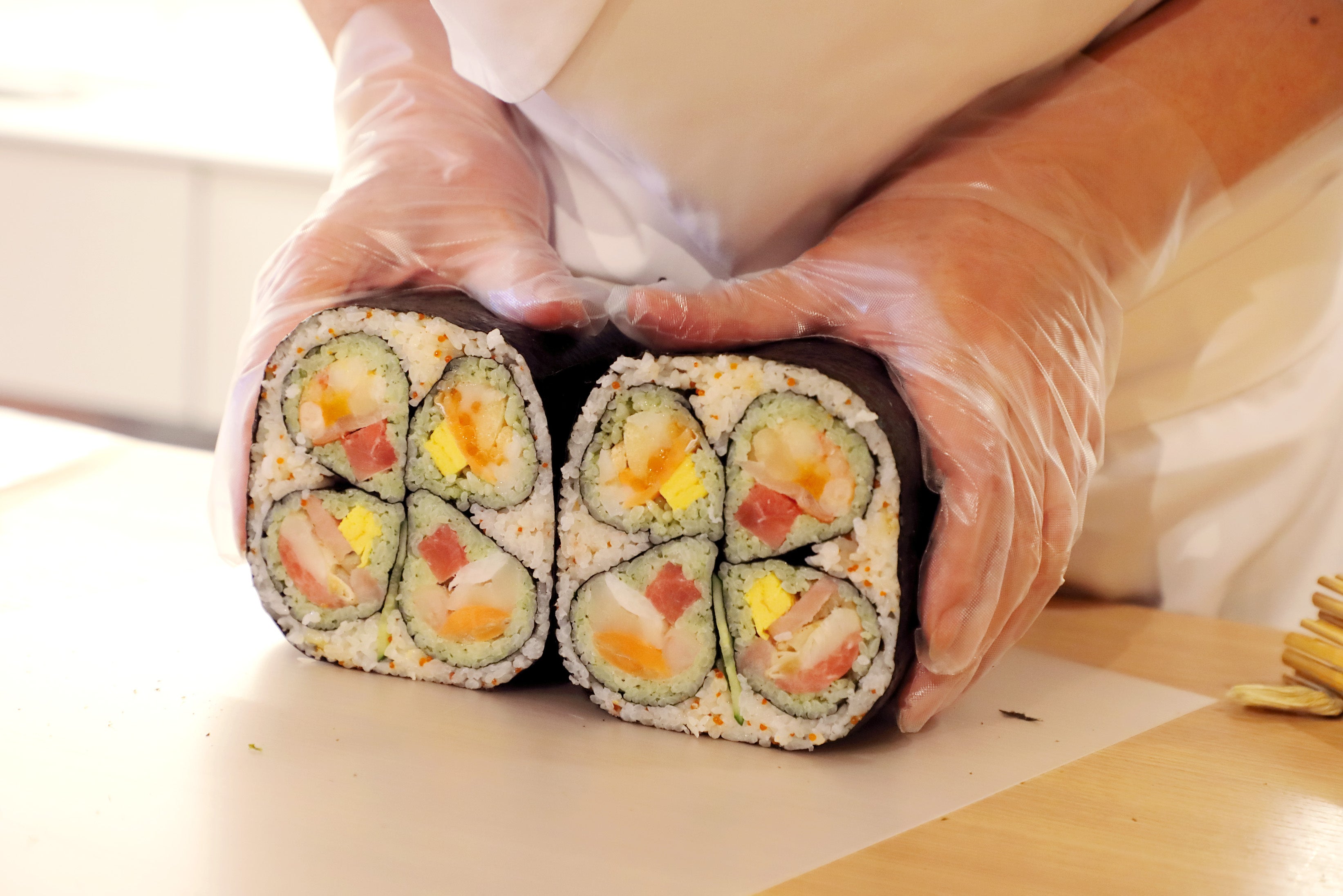 会場では、直径が9.5cmもある「幸せを呼ぶ!クローバー海鮮絵巻」をその場で巻きあげる実演が行われました。 人気の海鮮巻をベースにし見た目にも幸せな気分になる大きな四つ葉のクローバーは、家族や友人とシェアして食べるのにぴったりな商品となっております。
