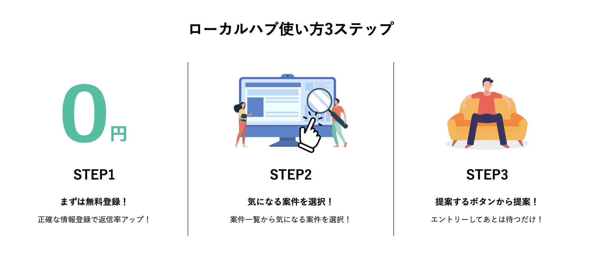 プラットフォーム上では、簡単に、案件の確認、「提案するボタン」から自治体への提案のアクションを行うことが可能です。事業者自身で提案することが不安な場合は、元行政職員・行政営業コンシェルジュのオンライン相談で成約率が上がる方法や事業費の財源、エントリーすべき案件等、上手なローカルハブ活用方法が相談できます。