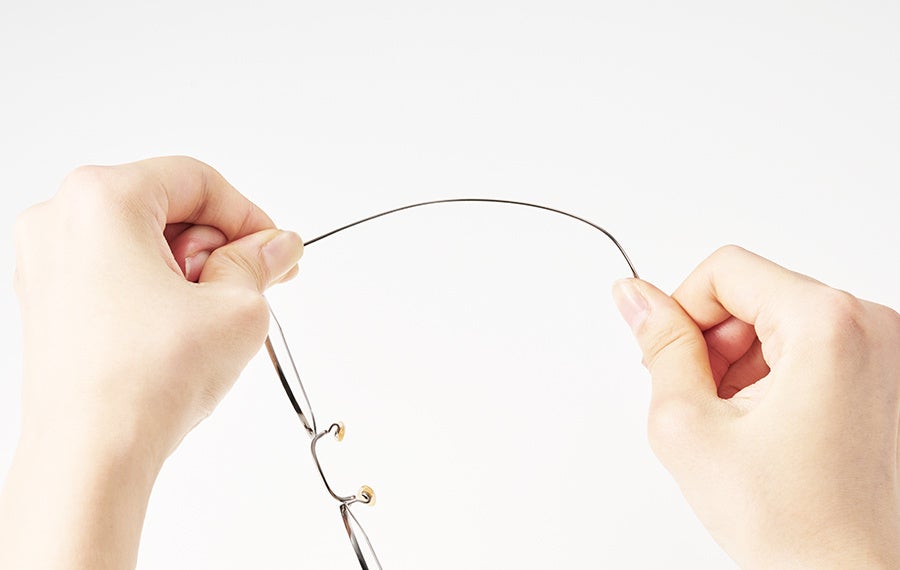 テンプル(つる)は、純チタンの丸線の状態から、たたいて延ばす『スウェージング工法』で作られています。金属密度が高められることで強度と柔軟性が備わり、メガネをかけたときのホールド感が上がります。