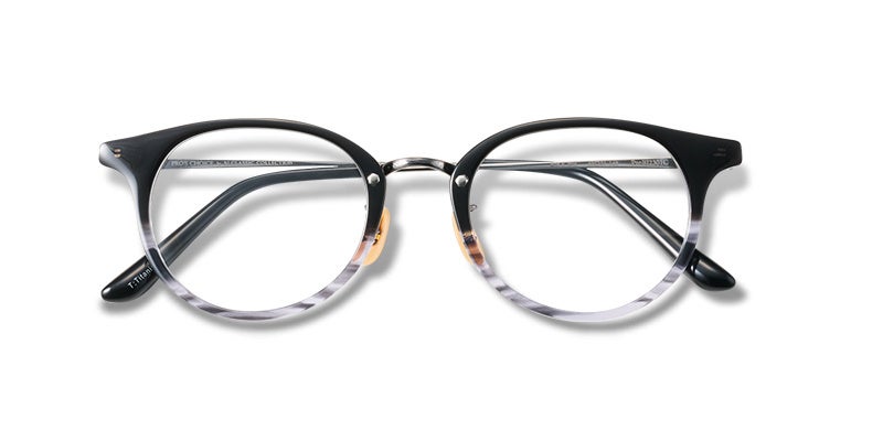 プラスチックリムとメタルブリッジのコンビフレーム。抜け感のある丸いボストンシェイプに、直線的なトップリムとメタルパーツがきちんと感を加え、さらっとトレンドコーデができる便利なモデル。