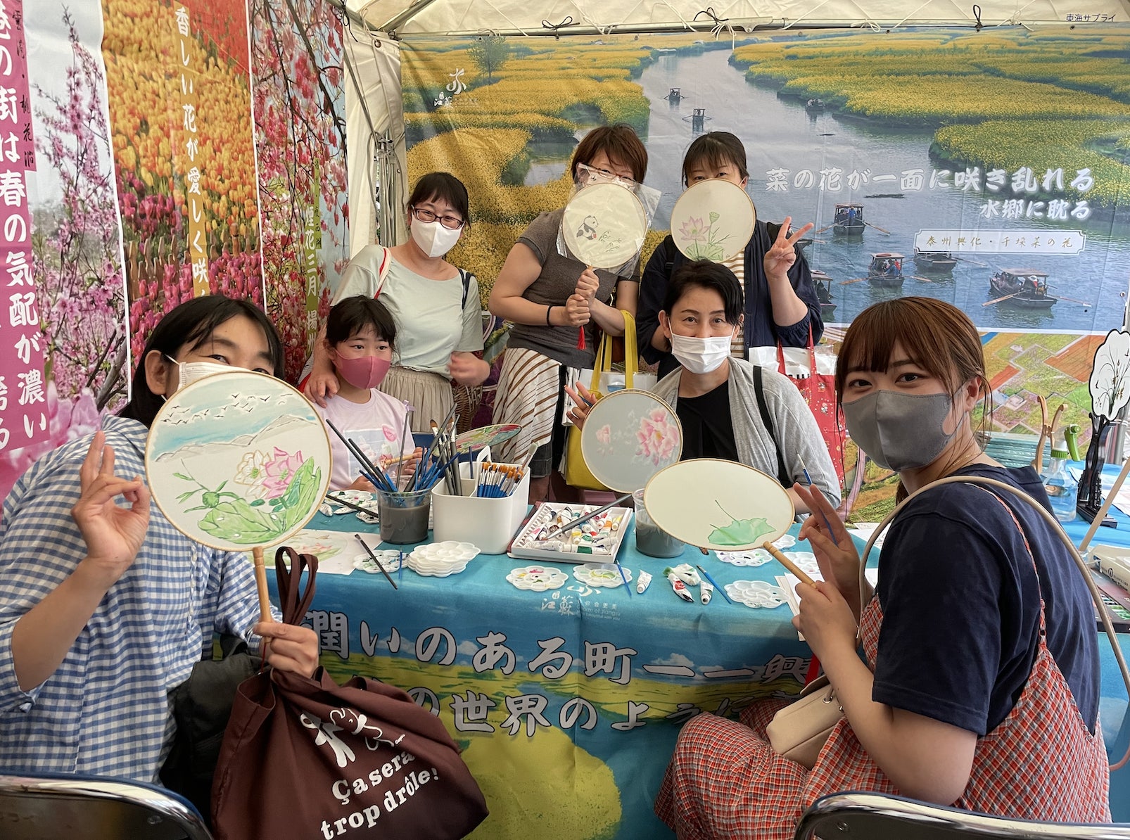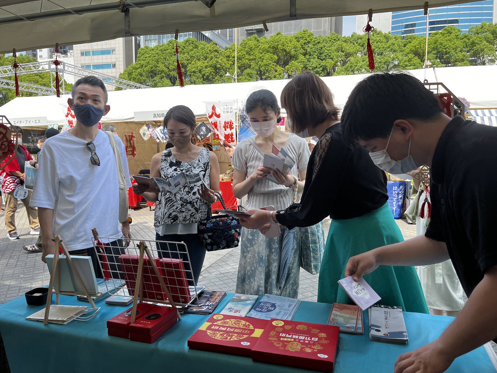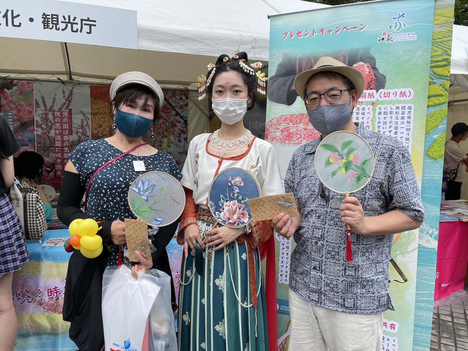 蘇州の「製扇技術」の歴史は古く、国家級無形文化遺産でもあり、一家団らん、万事めでたく意のままに運ぶことを表しています。来場した人々は一枚一枚の真っ白なうちわに心の中に浮かぶ江蘇省のイメージを描き、江蘇省への思いを表しました。また暑い夏の間はうちわで軽く扇ぐと古典的な趣を感じます。人々はまた「江南の山水 夢の江蘇 あなたと輝く」「江蘇が大好き」などと書かれたパネルを手に一緒に写真を撮り、周りの友人に一緒に江蘇を旅行しようと呼びかけました。さらに会場の人々のために用意された雲錦の手作りハンドバッグ、江蘇省の特色あるしおり、ポストカードなどの文化的なプレゼントは、観光客が江蘇省が作成した充電ケーブルのQRコードから同省の日本語サイトにアクセスし、無形文化財を体験すると同時に江蘇省の文化・観光資源を全面的に理解できます。