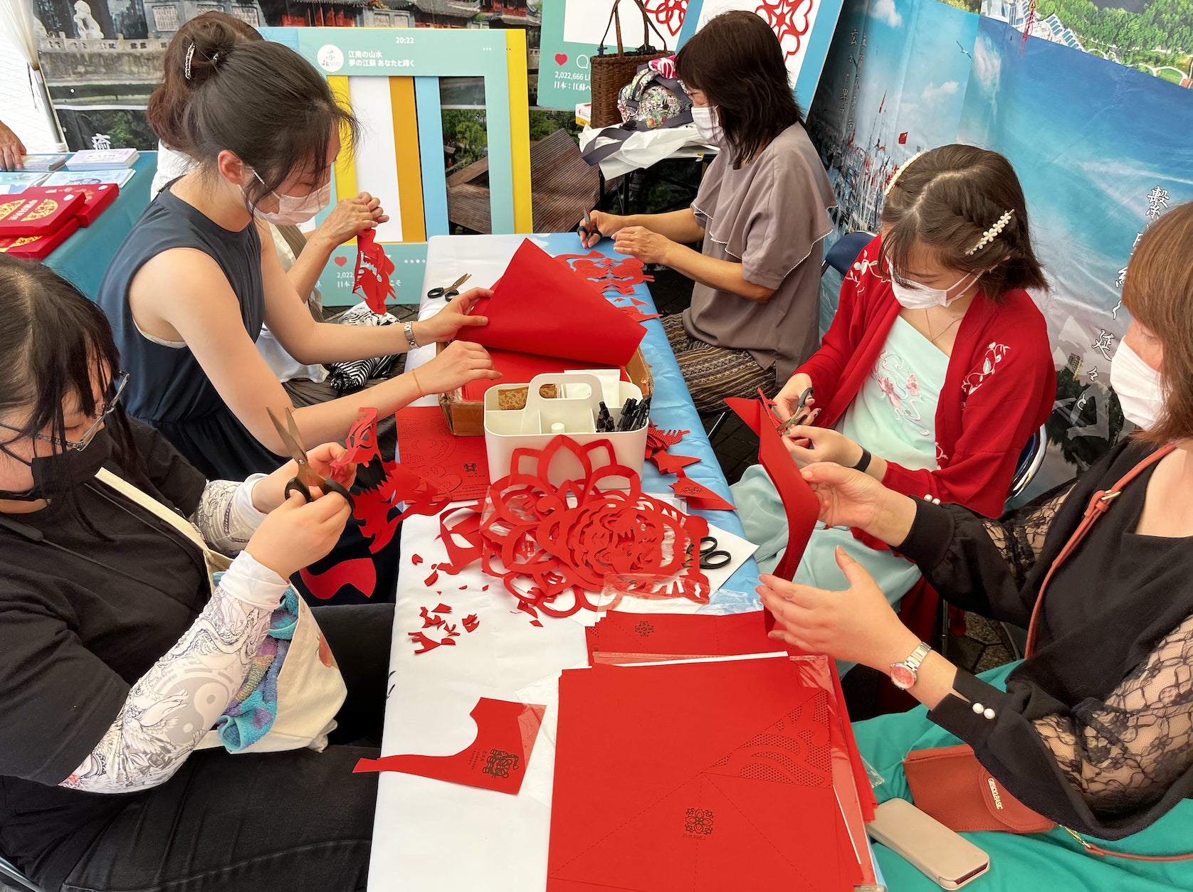 イベント期間中、江蘇観光(日本)ピーアールセンターは切り絵や夏の日の描写など双方向型のプログラムを用意して来場客の参加を呼び掛けました。切り絵は中国の最も伝統的な民間芸術の1つです。江蘇地域の切り絵の線は繊細で滑らかで、構図は精巧、技法は革新的で、透かし彫りの芸術は視覚的に空が透けて見える感覚と芸術の楽しみを与えてくれます。会場には赤いアートペーパーとはさみが配置され、日本の人々を招待して一緒に制作しました。はさみの動きにあわせて切られた赤い紙はさまざまな形に変化し、生き生きとした姿を見せ、会場にいた観光客は江蘇省の切り絵文化の魅力を実感しました。