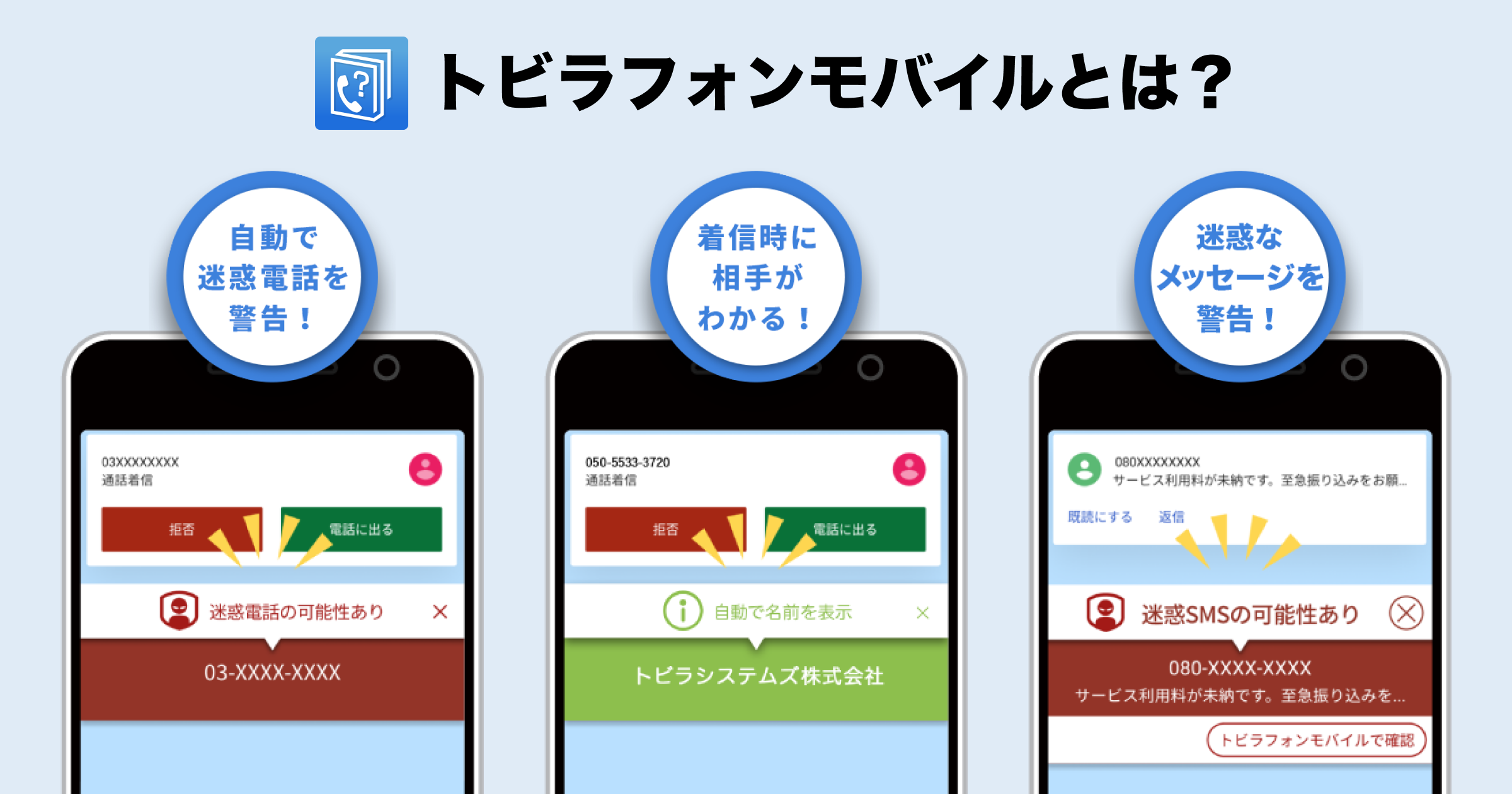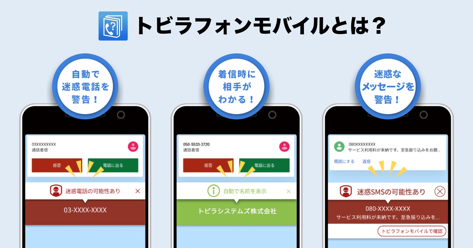 「トビラフォンモバイル」は、迷惑電話の着信時に自動で警告・拒否を行い、危険な電話に出るのを未然に防ぎます。着信時だけでなく、発信のダイヤル時にも危険をお知らせするため、詐欺被害の防止につながります。また、電話帳に登録していない番号も、トビラシステムズのデータベースと合致する場合は発着信時に事業者名称を表示するので、安心して電話に出られます。