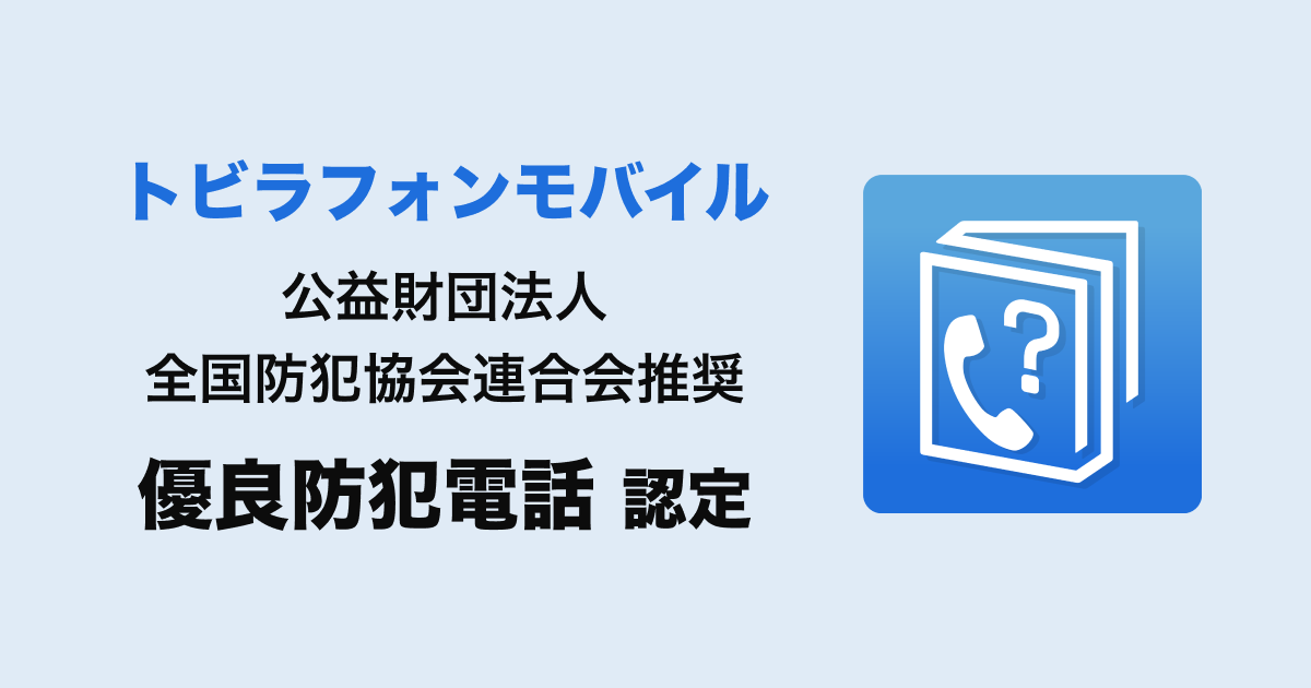 今回、アプリとして初めて、トビラシステムズが提供する「トビラフォンモバイル」が全国防犯協会連合会推奨の「優良防犯電話」に認定されました。