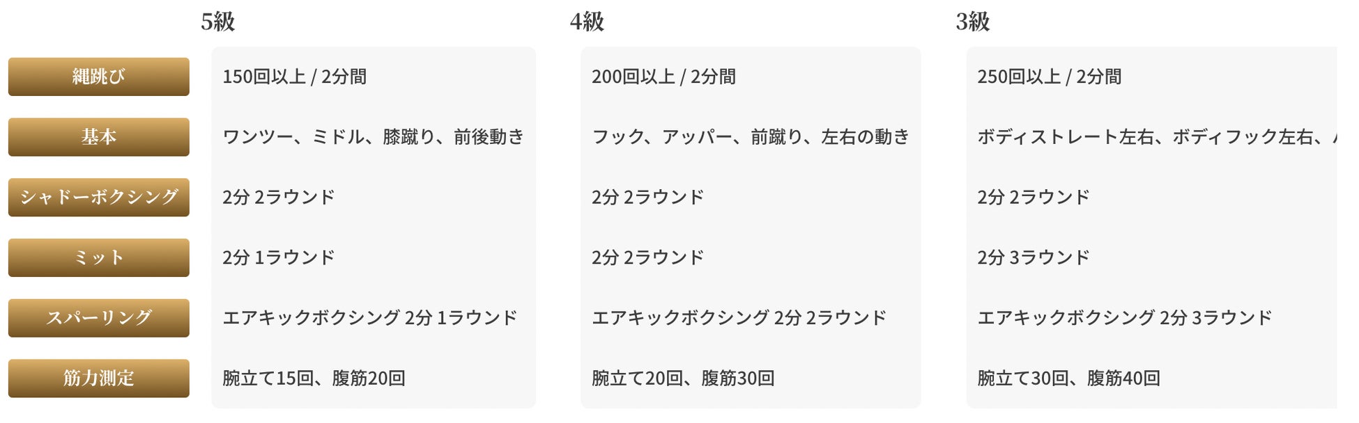 どこまでやればいいか何をやればいいか継続が難しく、モチベーションの維持も難しい。そこで小比類巻道場オンラインでは、キックボクシングの楽しさを伝えるために、キックボクシングで初の昇級制度を作成し、小比類巻貴之が昇級審査を行います。登録後は無級から開始し、合格すれば5級、1級となります。