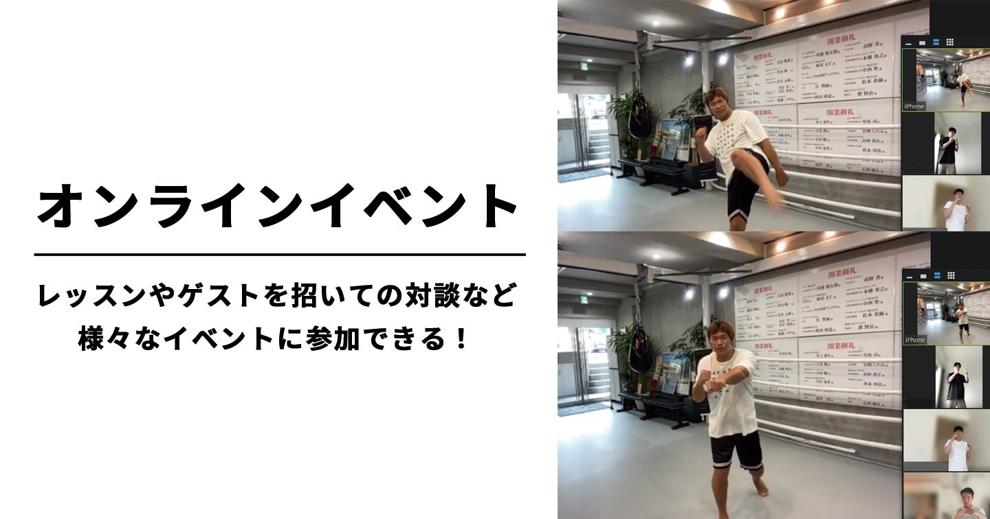 小比類巻貴之から直接オンラインで指導を受けられたり、小比類巻貴之の愛弟子であり、現役の選手である京介より朝練などを定期的に受けられるオンラインイベントや、小比類巻貴之が招待するゲストとの対談など、様々なオンラインイベントを実施します。