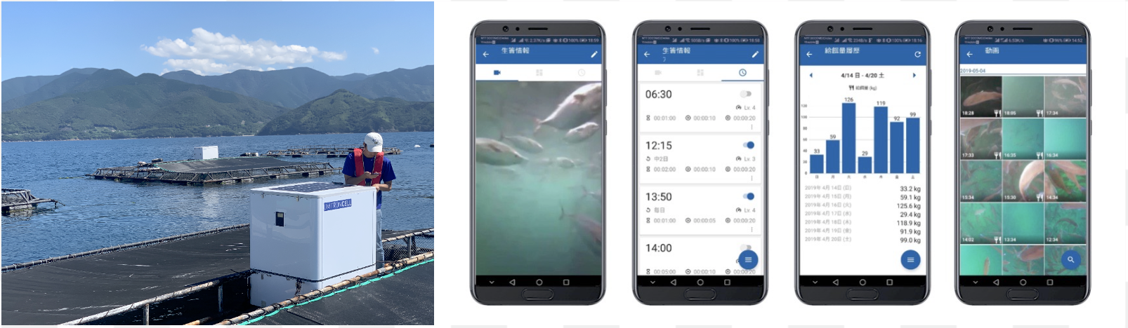 「UMITRON CELL」は、AI・IoT技術を活用した水産養殖者向けスマート給餌機です。スマートフォンなどの端末から生け簀で泳ぐ魚のリアルタイム動画を見ながら遠隔で餌やり操作が可能。また、AIが魚の食欲を判定し、餌量やスピードを最適化、制御することができるため、労働負荷の削減と餌の最適化、海へ餌が流出することを防ぎ環境に配慮した養殖業の実現に貢献しています。