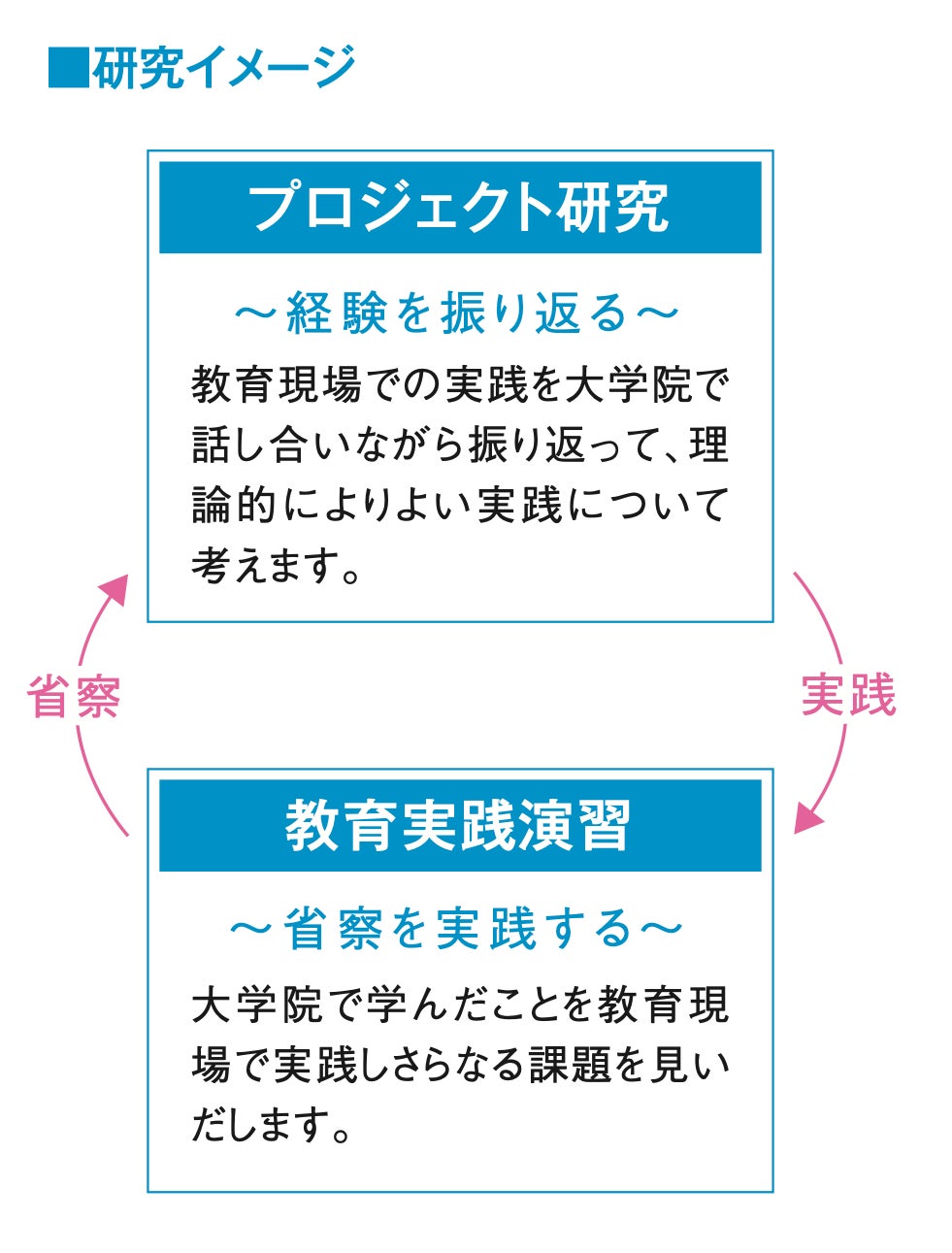 ・ICT・情報資源活用特論 等実践的な学びにより、学んだことをすぐに保育現場で実践し、職場にフィードバックすることで、保育の質、職場環境の改善につなげるほか、その結果を大学院に持ち帰ることで新たな学びに活かしていきます。