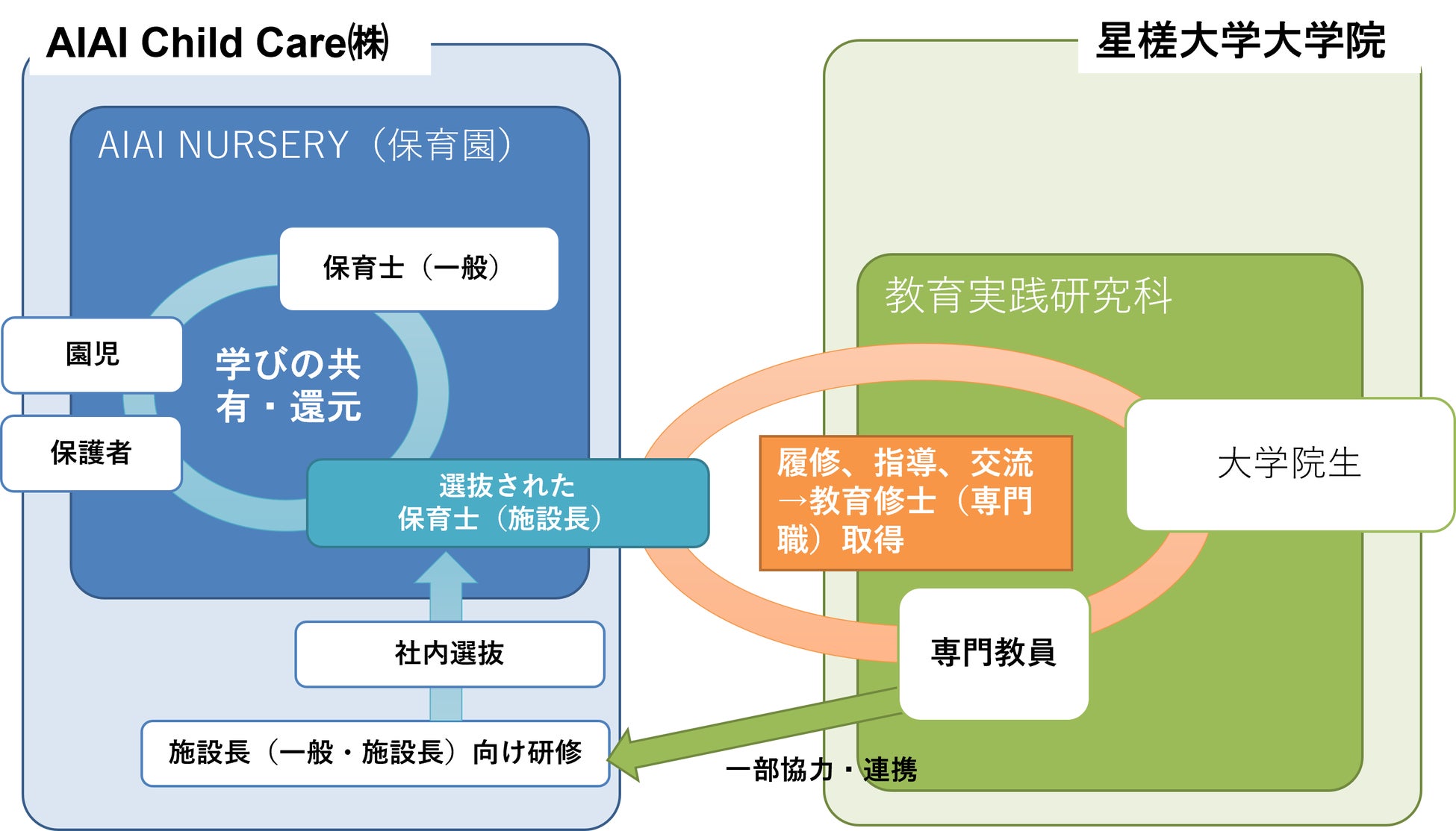 星槎大学大学院(横浜市中区、山脇直司学長)と、首都圏と大阪市で認可保育園や障害児支援事業所を運営するAIAI Child Care株式会社(以下ACC、東京都墨田区、代表取締役社長 貞松成)は、乳幼児教育の専門性向上、保育士のキャリアアップなど目的とした包括連携協定を締結し、2022年度から2名の保育園施設長が同大大学院に入学いたしました。保育士は、園で働きながら大学院での実践研究やともに学ぶ多様な方々との交流を通じて、乳幼児教育、組織マネジメントなど幅広く専門的な知見を得て、子どもたちや保護者、園や地域の皆さまに還元します。また、星槎大学大学院では現場で働く保育士を受け入れ、働く大人が学びやすい環境を提供し、社会人が職務の中で見つけた課題を、自身の気づきと学びを通して解決していくことの必要性とその価値を広く発信してまいります。