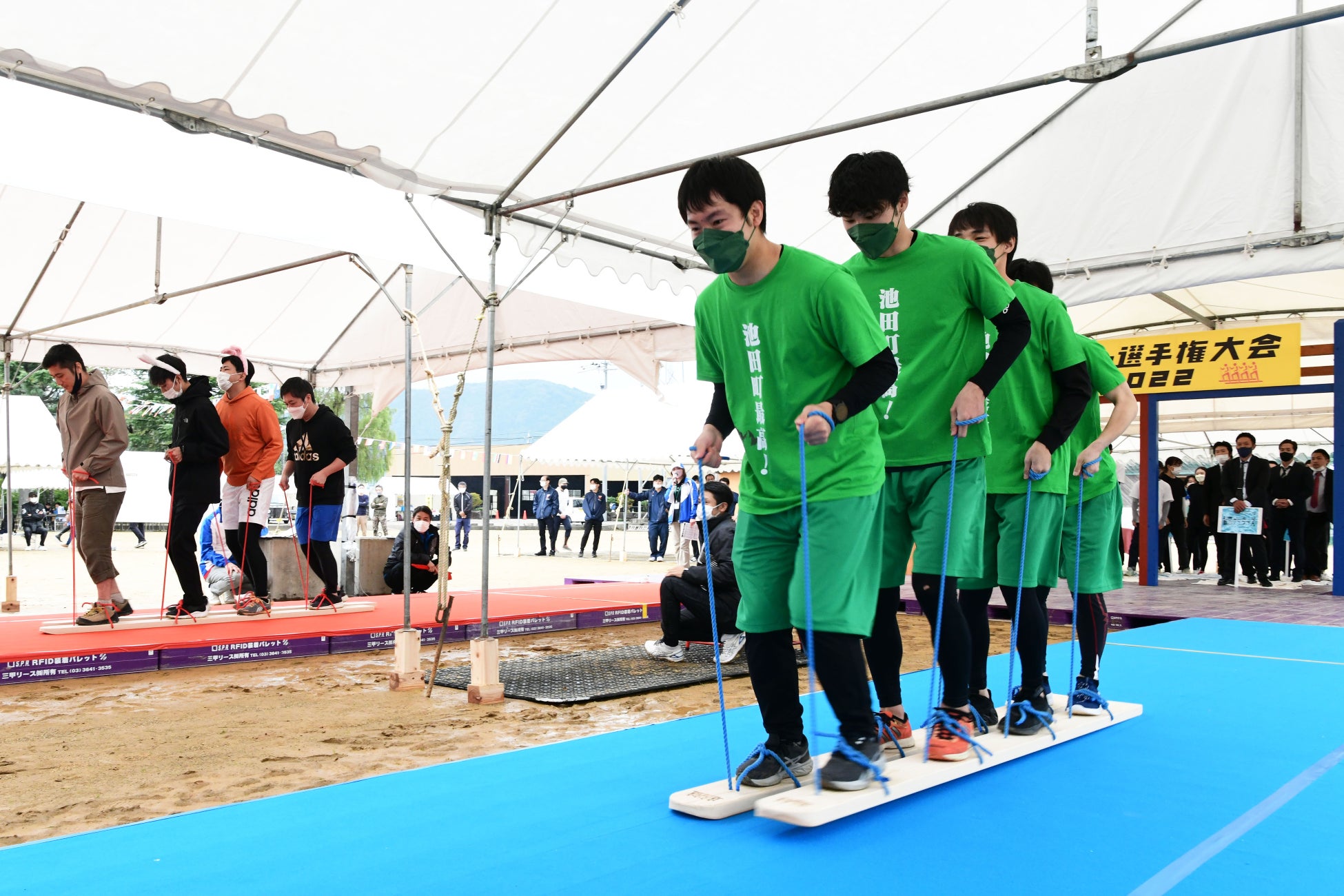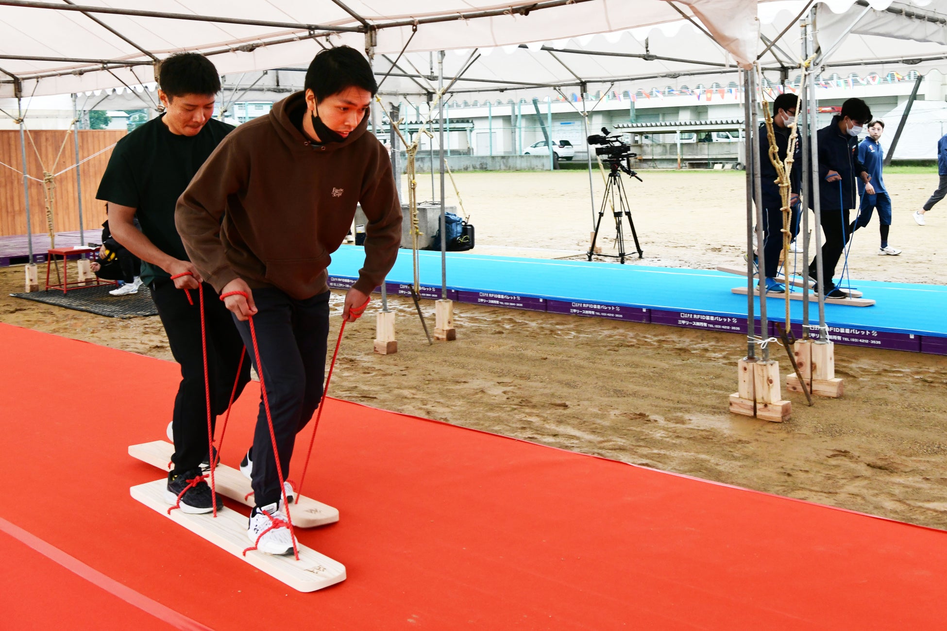 木望の森100年プロジェクトに取り組む中、平成29年に池田町で考案された、木を活かしたスポーツです。ウッドスポーツには「木ッター」「立ッター」「ゲッター」の3種目ありますが、今大会は長い下駄を履き直線コースを駆け抜ける「ゲッター」の選手権を開催。選手同士の協働が勝利へのカギを握る競技です。