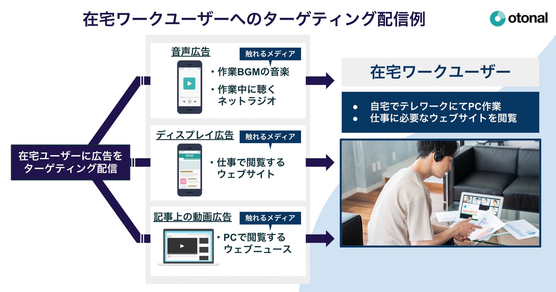 在宅ワークをするビジネス層に配信を行う広告ターゲティングです。ユーザーが仕事中に接触するメディア&デバイス絞りこみと在宅ワークのターゲティングを同時に行い、音声・動画・バナー広告の配信を行います。