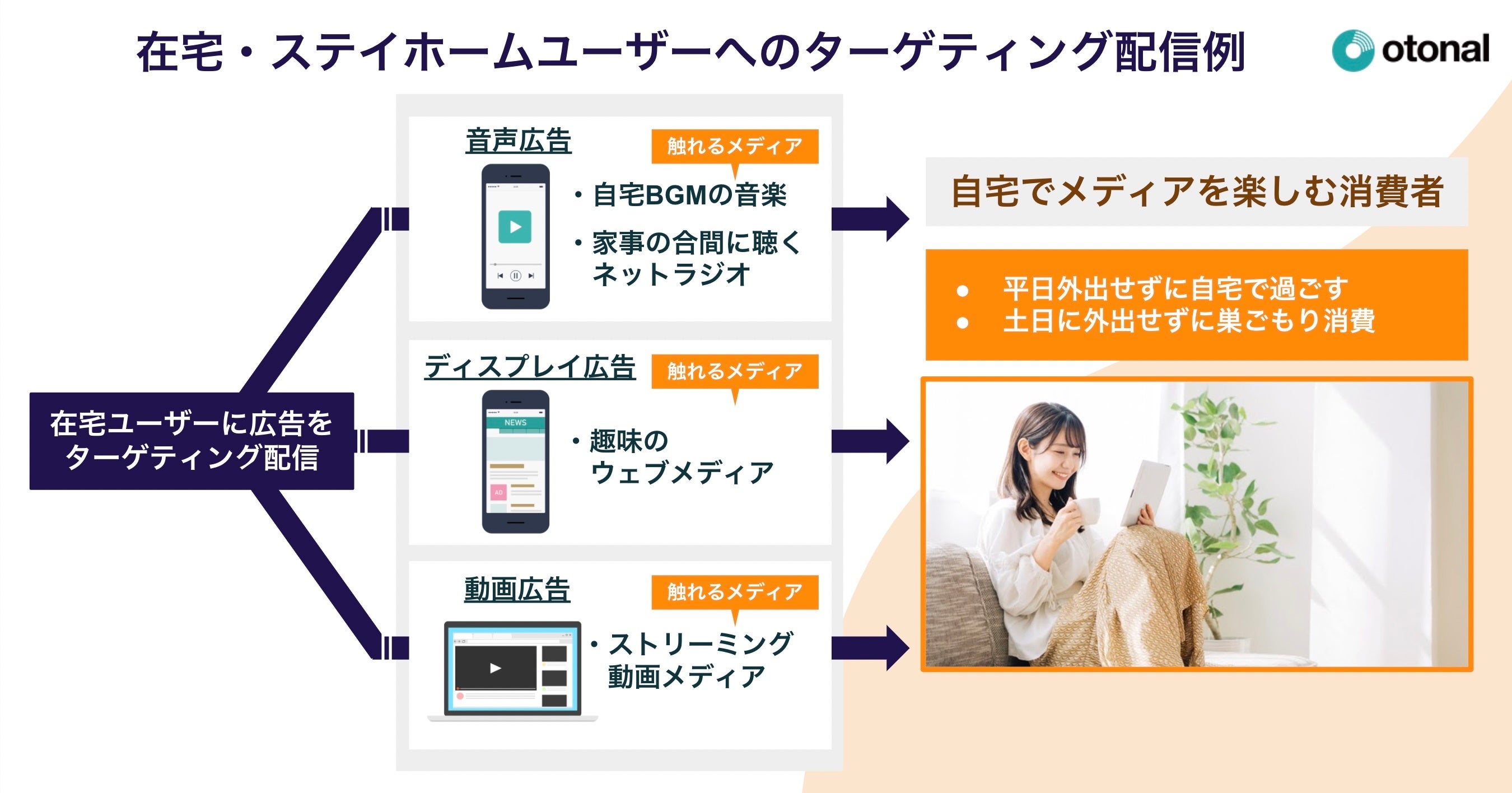 ■ 在宅ユーザーにターゲティングし、音声・動画・バナーを広告配信