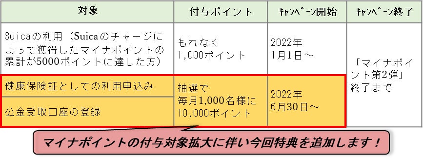 ○JR東日本は、新たに「健康保険証としての利用申込み」または「公金受取口座の登録」を行っていただいた方を対象に、抽選で毎月1,000名様に10,000ポイントJRE POINTがあたる特典を、実施中の「マイナポイントはSuicaで貯めよう!キャンペーン第2弾」に追加します。
