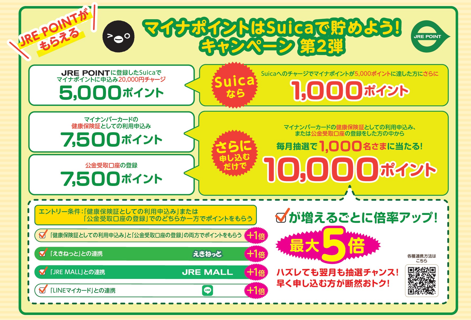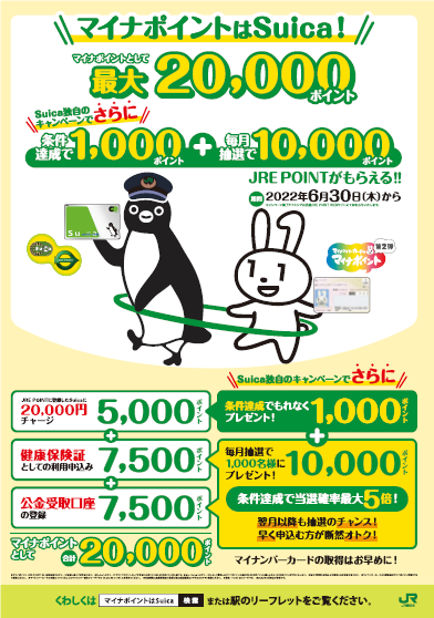 マイナポイントで「健康保険証としての利用申込み」または「公金受取口座の登録」に対するポイント付与をSuicaでお申込み※1いただき、ポイントが付与された方を対象に、毎月※2抽選で1,000名様にJRE POINTを10,000ポイント付与いたします。