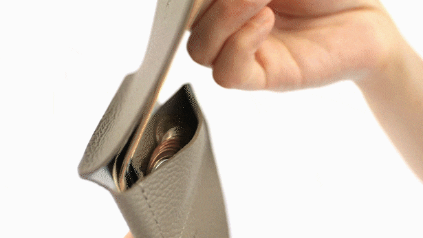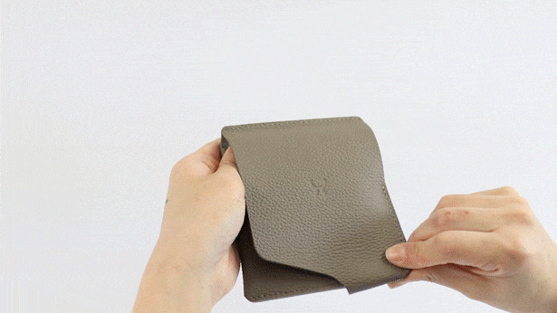 財布本体のフラップだけでなく、お札もフタの役割をする画期的なアイデアで生まれた時短設計がフラップを持って閉じるワンアクションでコイン、カード、お札、全てをホールドします。