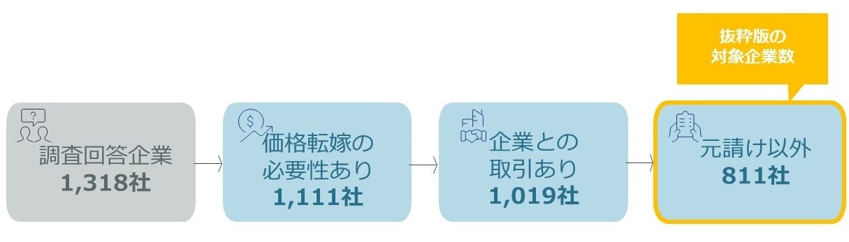 具体的には、「第55回定期景況調査」に回答した1,318社のうち、「コスト上昇の影響を受けていない、または価格転嫁の 必要がない」と回答した企業を除き、そこから「一般消費者との取引が主」と回答した企業を除き、さらに取引において 「元請け(自社が最終製品・サービスを提供する立場にあり、発注のみ)」である企業を除いた回答者811社を対象としています。
