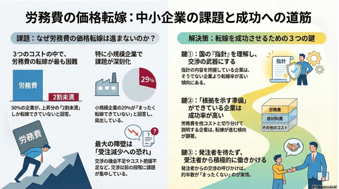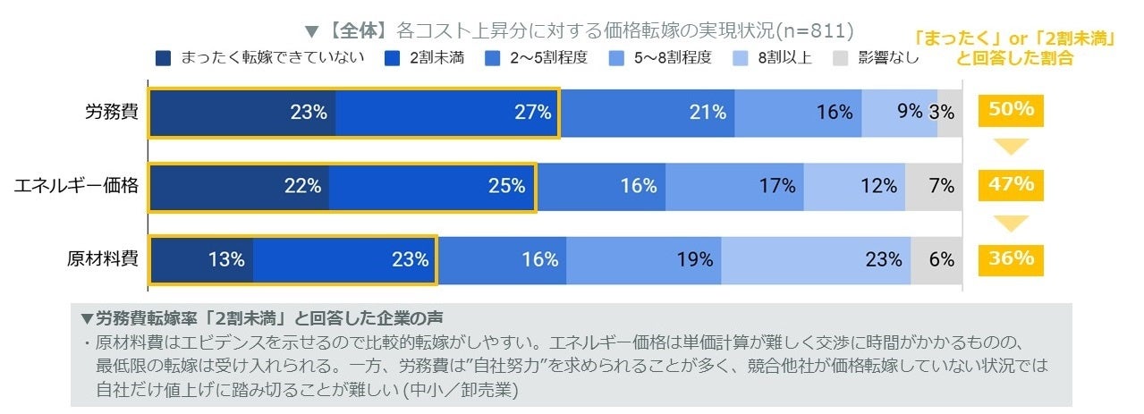 原材料費やエネルギー価格に比べ、労務費は最も価格転嫁が困難であることが明らかになりました。