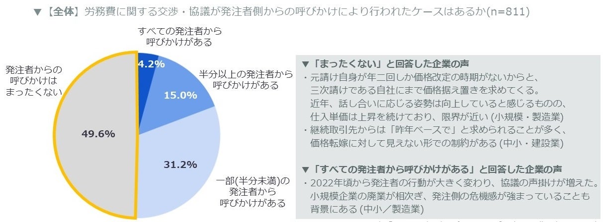 労務費に関する協議が、発注者側から呼びかけられたケースは極めて少数であり、約半数の企業が「まったくない」と回答しました。