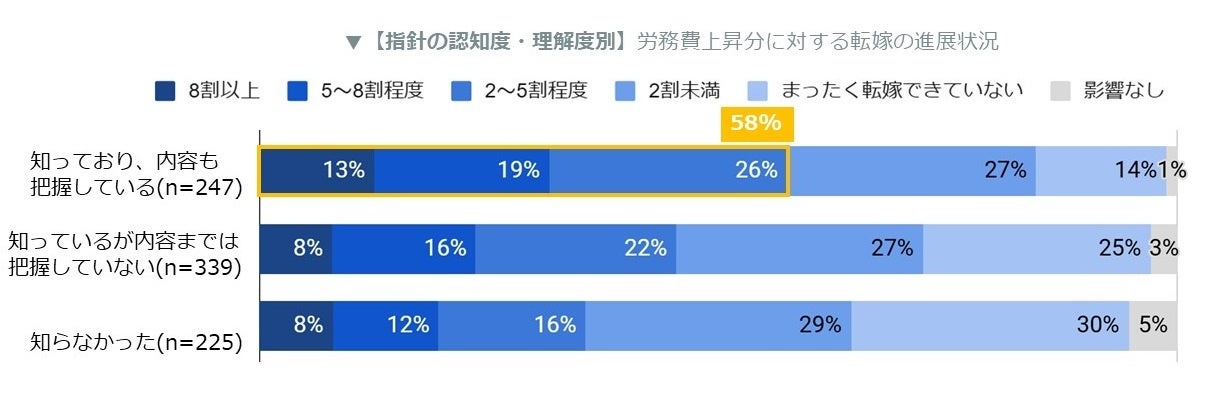 さらに、指針の内容を理解している企業ほど、労務費転嫁が進んでいる傾向が確認され、制度の“理解”が“実践”につながっていないことが大きな課題として浮き彫りになりました。