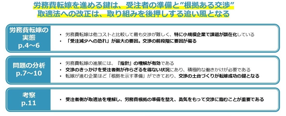 一方、労務費を他のコストと切り分け根拠を示せている企業ほど転嫁が進んでいることから、各種の公表資料(春闘、最低賃金改定など)を活用して根拠を示すことで、交渉が前進する可能性が高いことも明らかになりました。