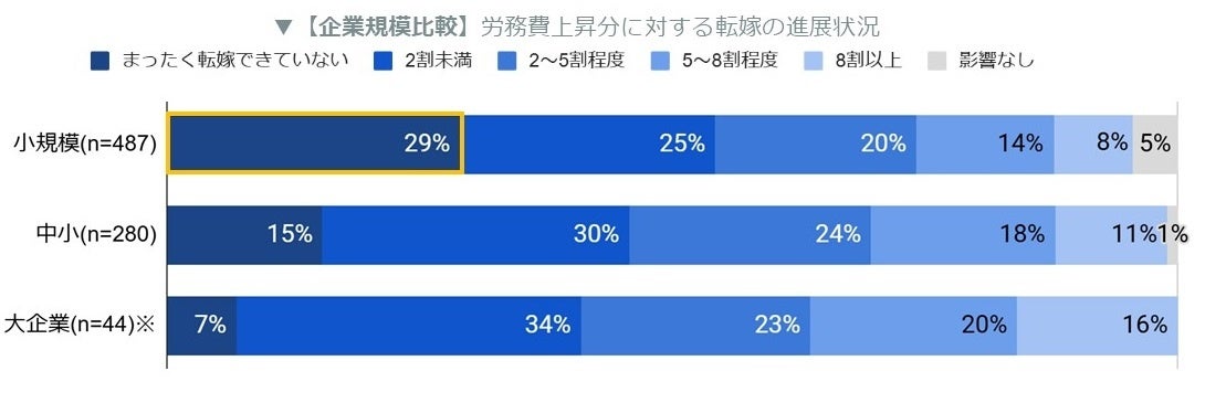 企業規模別に分析したところ、小規模企業では約3社に1社が「まったく転嫁できていない」と回答しており、企業規模が小さいほど影響が顕著です。