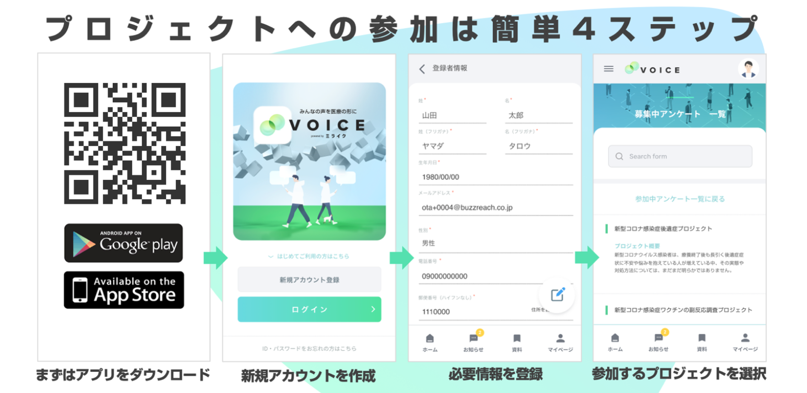 同プラットフォームでは、薬が承認された後のマーケティング支援も可能となり、エンドユーザーとなる患者の声をSNSで収集する『ミライク』および日常的に利用できるePROアプリ、『VOICE』を用いてリアルな患者の声を製薬企業へフィードバックし、製品改善や新たな創薬へと繋ぎます。