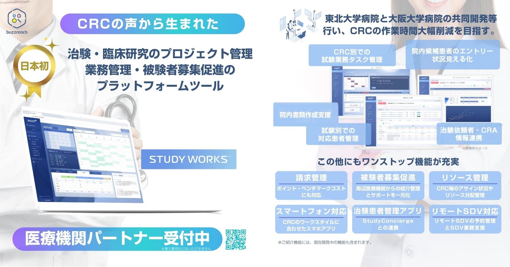 また、Study Worksのもう一つの提供価値として周辺医療機関(サテライトサイト)に治験情報を共有し、候補患者の紹介を管理する被験者募集促進機能も搭載しております。これまで200試験以上の支援実績があり、当社の一番の強みでもある被験者募集支援も機能として搭載することで、治験実施医療機関内のみで治験参加患者の確保をする課題を解決することがででき、治験全体スピードアップに繋がります。