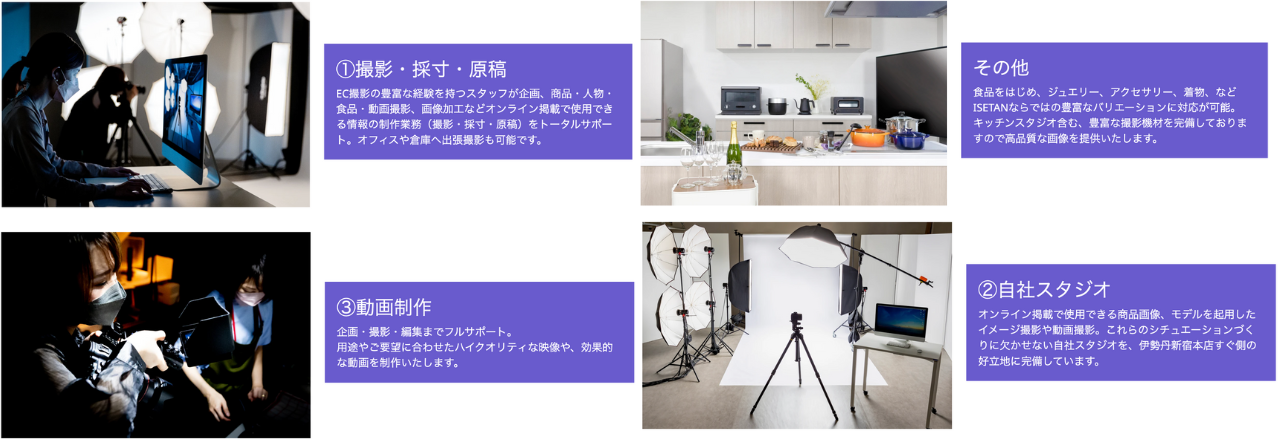 そこで、EC撮影の豊富な経験を持つISETAN STUDIOと連携することにより、企画、商品・人物・食品・動画撮影、画像加工などオンライン掲載で使用できる情報の制作業務(撮影・採寸・原稿)を、お客様のご意見に寄り添いながら高品質で安価なプランにてご提案することが可能になります。