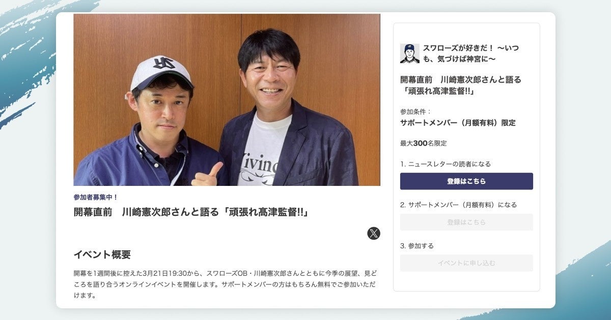 ノンフィクションライターの長谷川晶一さんがtheLetterで運営するニュースレターメディア「スワローズが好きだ! ~いつも、気づけば神宮に~」では、元プロ野球選手の川崎憲次郎さんを招いてオンライントークイベントを開催。好評を博したことから、すでに次回の開催も予定されています。