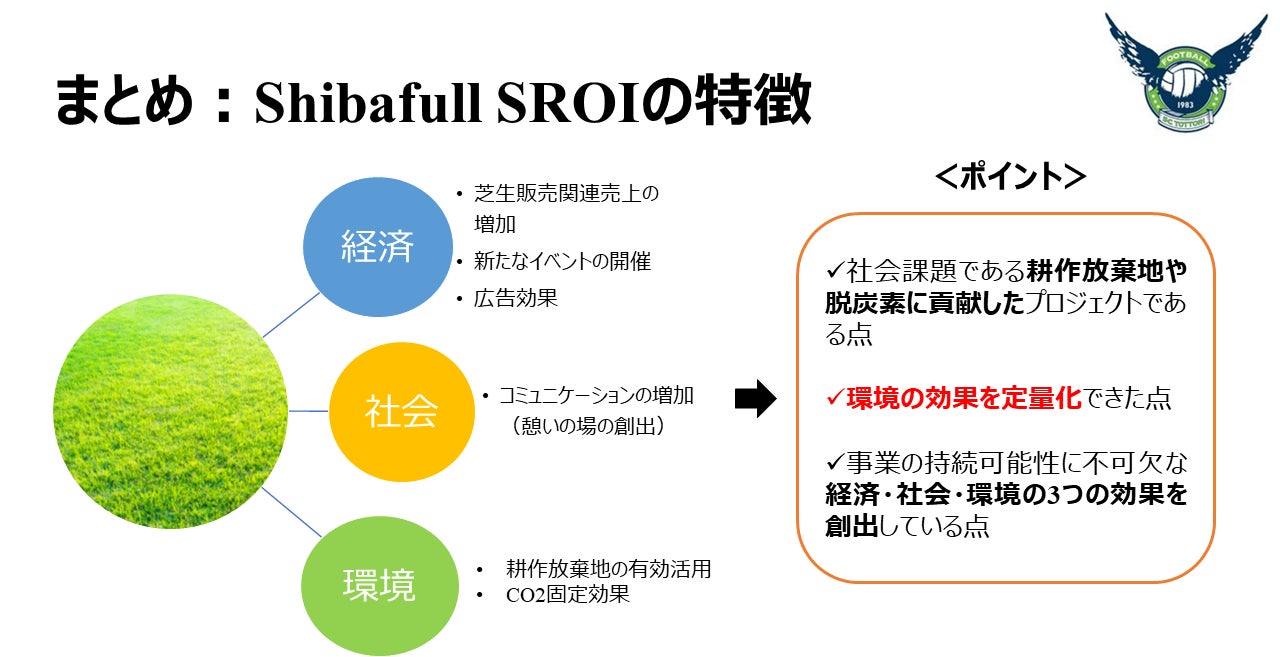 2017年に「Shibafull(しばふる)」を立ち上げ、地域企業・行政のみなさまに協力を頂きながら耕作放棄地を利活用した芝生生産、また販売(芝生化)を進めてきました。今回の定量化するプロセスで改めて生産・芝生化に関わるみなさまとの対話を通じ本プロジェクトの意義を再確認し、こうして効果を可視化することができました。地域にこのクラブがあって良かったと思っていただくことはとても大切なことです。そのきっかけとしてスポーツだけでなくこうした活動、結果をもとにつながりを更に広げていきたいと思います。最後になりますがSROIの測定、調査にご協力いただいたみなさまに改めて御礼申し上げます。