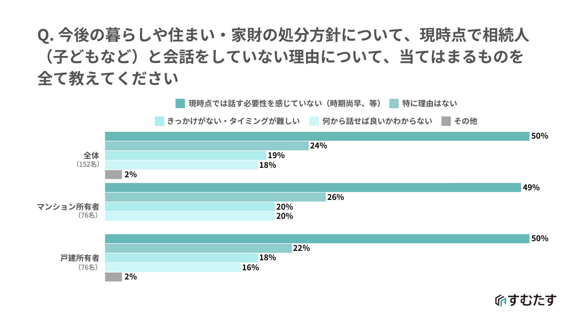 今後の暮らしや今の住まい・家財の処分方針について、7割がまだ会話をしておらず、うち半数は「現時点では話す必要性を感じていない」と回答しています。