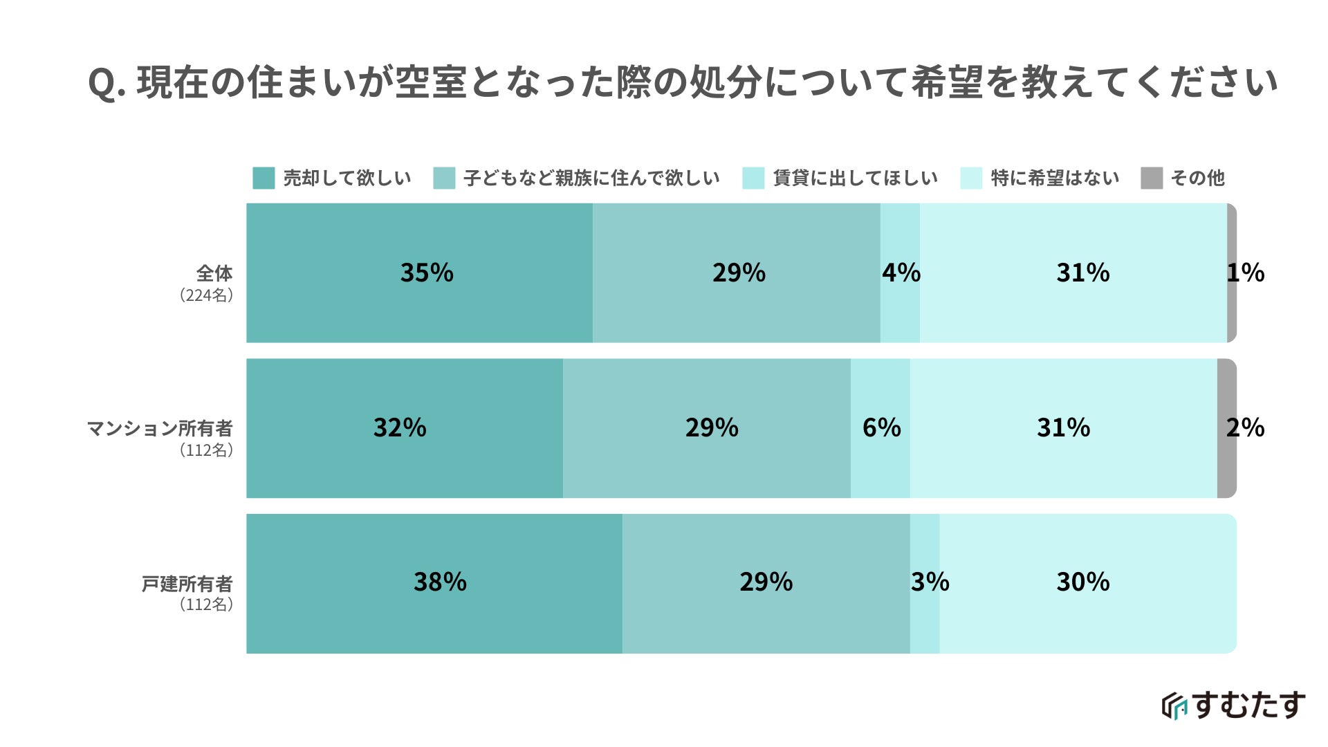 相続のほか施設入居、親族との同居等により現在の住まいが空室になった場合の処分方針について、約7割は何らかの希望を持っていました。うち約半数は売却を希望している一方、約半数は子どもなど親族に住んでもらうことを希望しており、親子間で意思確認が必要そうです。