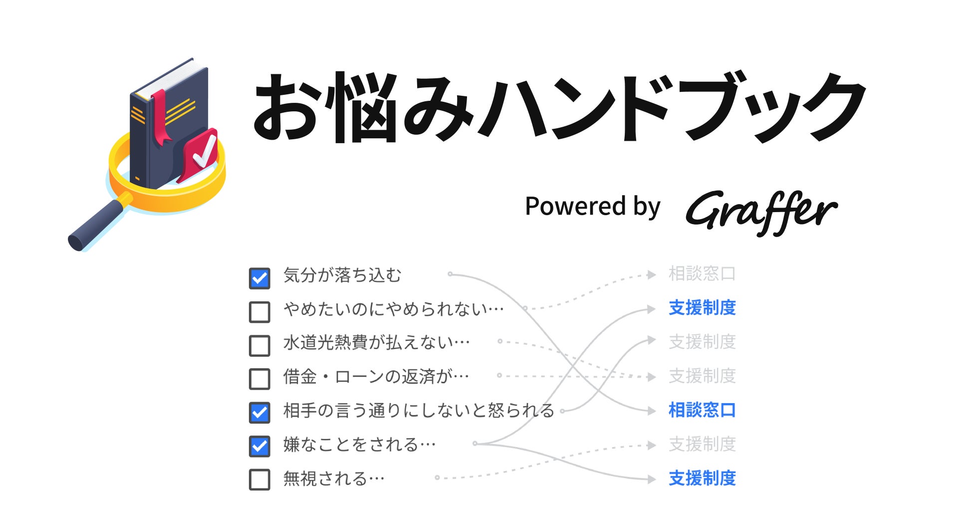 行政サービスのデジタル変革を手掛ける株式会社グラファー(本社:東京都渋谷区、代表取締役:石井大地、以下「グラファー」)は、一人ひとりの悩みに合わせた支援を利用しやすくする新サービス「お悩みハンドブック 全国版」を公開しました。スマートフォン・ウェブから質問に答えていくだけで、自分にあった様々な公的な支援を調べることができます。