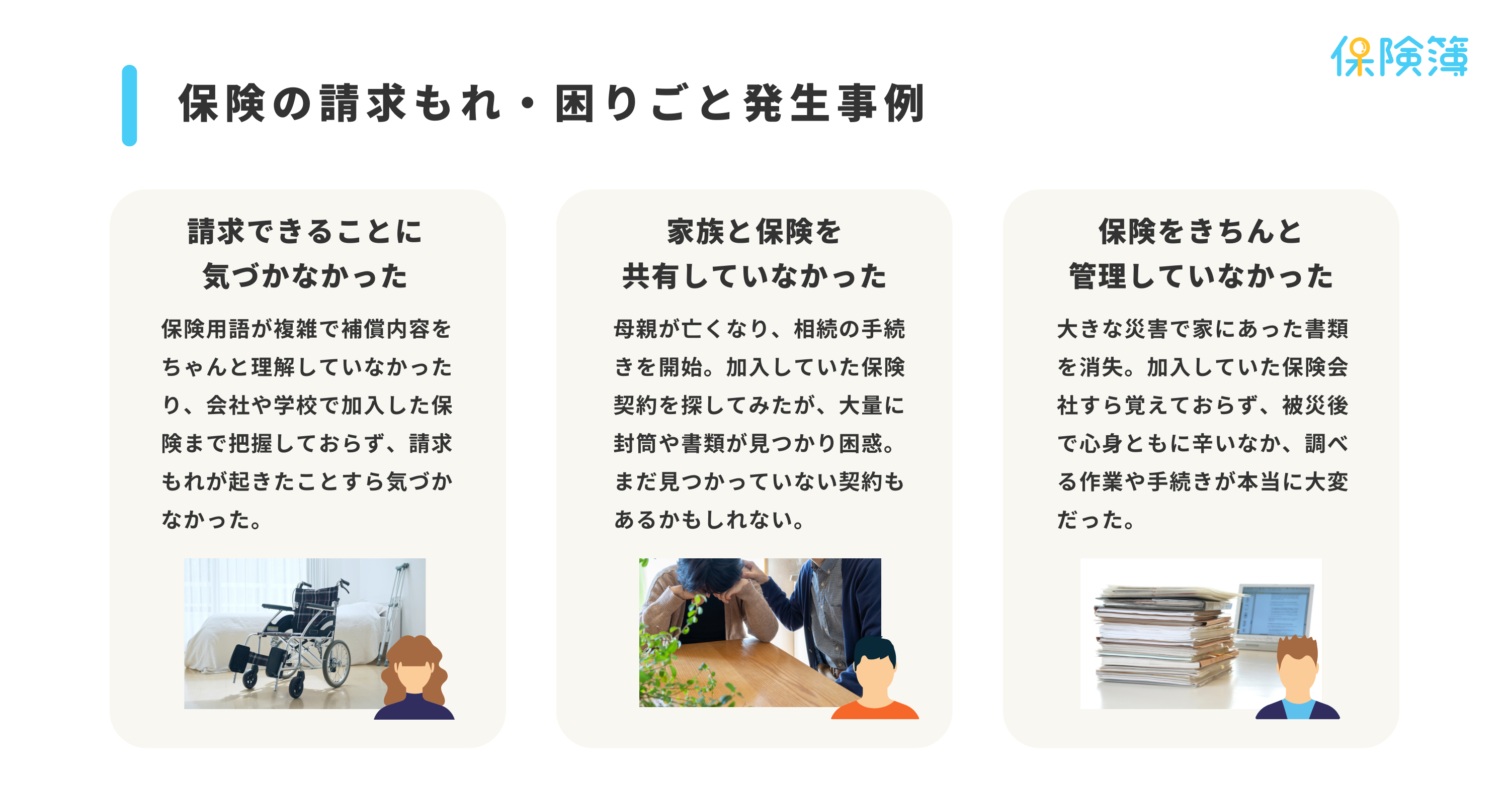 請求もれを防ぐためには、まず保険加入者自身が「これって請求ができるかも?」と気づくことが大切です。同時に、実際に請求する未来を想定して保険を管理しておくことも重要です。本コンテンツが、請求できる可能性に気づくためのヒントに、そして保険管理をはじめるきっかけとなることを期待しています。