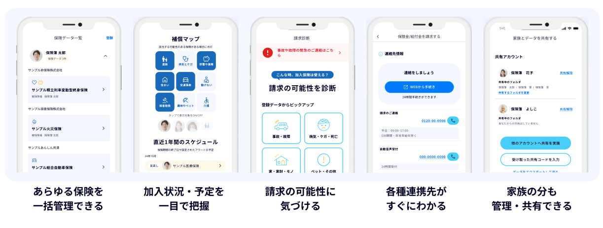 必要な時にすぐに契約内容を把握して保険会社の連絡先をスムーズに確認できるだけでなく、事故や病気・ケガ等の発生した事象を選択するだけで、データ化した保険の中から保険金請求ができる可能性がある保険を簡単にピックアップできます。