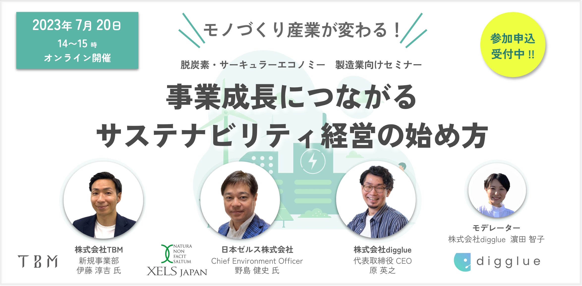 そんな中で、日本の産業の中核を担ってきたモノづくり産業である製造業では、今後どのような対応を求められていくでしょうか。今回のイベントでは、カーボンクレジットに関するプラットフォームの構築と企業への導入を進めてこられた 日本ゼルス株式会社 代表 野島 健史氏、環境配慮の新素材LIMEXを広めるユニコーン企業・株式会社TBMで、新サービスScopeXの中核事業メンバーである 株式会社TBM 新規事業本部 伊藤 淳吉氏、製造業でのDXと、DXを通じたサーキュラーエコノミーの推進実績を持つ株式会社digglue CEO 原 英之が、事業成長を促進するためにサステナビリティを取り入れる方法、製造業が競争力を高めるための新たな展望を議論いたします。