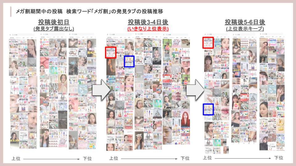 「じわじわ型」が3日目に発見タブの下位から表示されるのに対し、「急上位型」は3日目にいきなり上位に表示されます。