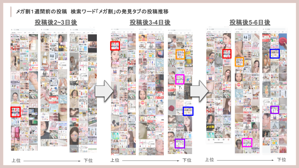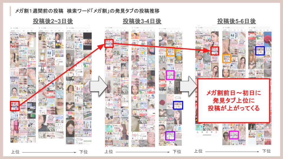 私たちgracemodeが運用する美容メディア「EMME」では、「保存」を重視した「じわじわ型」「急上位型」どちらにも適用した美容情報を日々発信しており、美容好きの多くが情報収集に使う「メガ割」関連の投稿でも、発見タブの上位に表示される実績が豊富です。