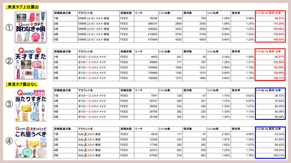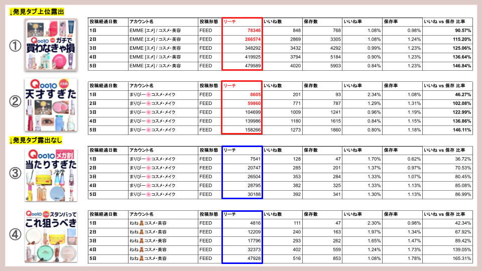 この初日に高い「いいね対保存比率」が、アルゴリズムに「この投稿は非常に有益だ」と即座に判断させ、2日目の爆発的なリーチの伸び(=発見タブへの露出)に繋がったと考えられます。