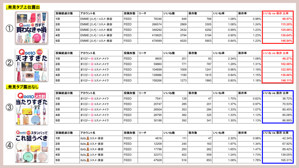 発見タブ上位表示の投稿①は、初日(24H)の時点で「いいね 848」に対し「保存 768」と、いいね対保存比率が90%という驚異的な高さでした。一方、伸びなかった投稿Cは、初日のいいね対保存比率が36%に留まっています。