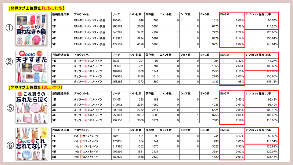 「じわじわ型」= 「保存数 > いいね数」となる有益なコンテンツ設計により、ターゲットとなるユーザーから緩やかにENGを獲得し、じわじわ発見タブの上位に表示される。