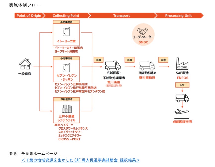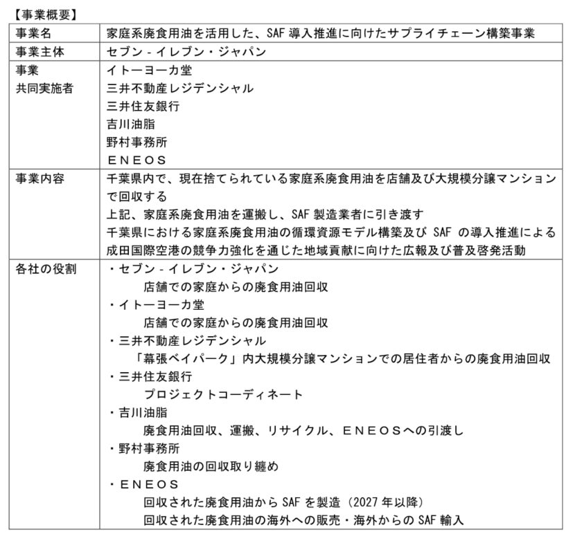 本事業は、千葉県総合企画部が公募した「千葉の地域資源を生かしたSAF導入促進事業」に対し、7社による連携スキームの提案が採択されたもので、そのうち、コンビニエンスストア、居住区における家庭系廃食用油のSAF向けサプライチェーン構築に向けた自治体との実証事業は本邦初の取組みとなります。