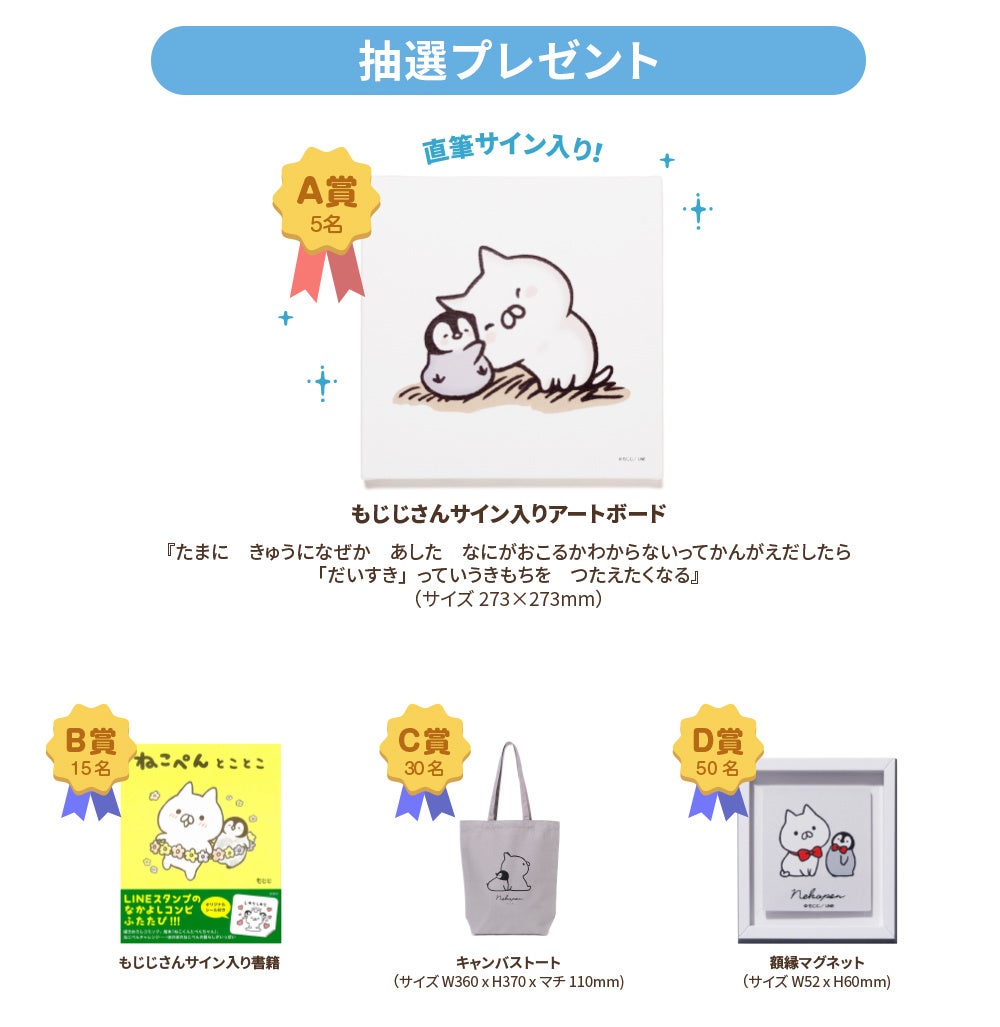 イラストレーターもじじさんによる、癒し系のLINEスタンプキャラクター。おだやかで優しいマイペースなねこの「ねこくん」と、素直でちょっとおっちょこちょいのぺんぎんの「ぺんちゃん」が、⼼をほっこりと温めてくれます。2014年、LINEクリエイターズスタンプに登場して人気を博し、LINE公式スタンプや企業とのコラボスタンプも続々リリース。ねこぺん村での「ねこくん」「ぺんちゃん」2⼈の仲良しほのぼの⽣活を楽しめる書籍やグッズなど、スタンプを超えて幅広く展開しています。