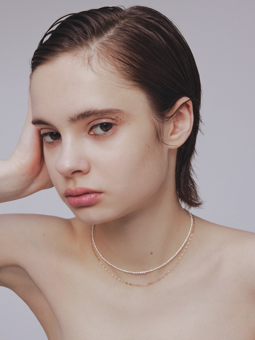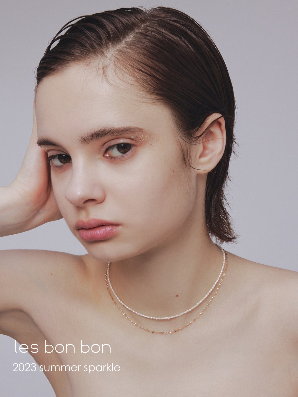 この夏、les bonbonが光を当てるのは、眩い程に煌めくメタリックチョーカーと海の“神秘”パールチョーカーに、煌めくチェーンを重ねるレイヤードスタイル。
