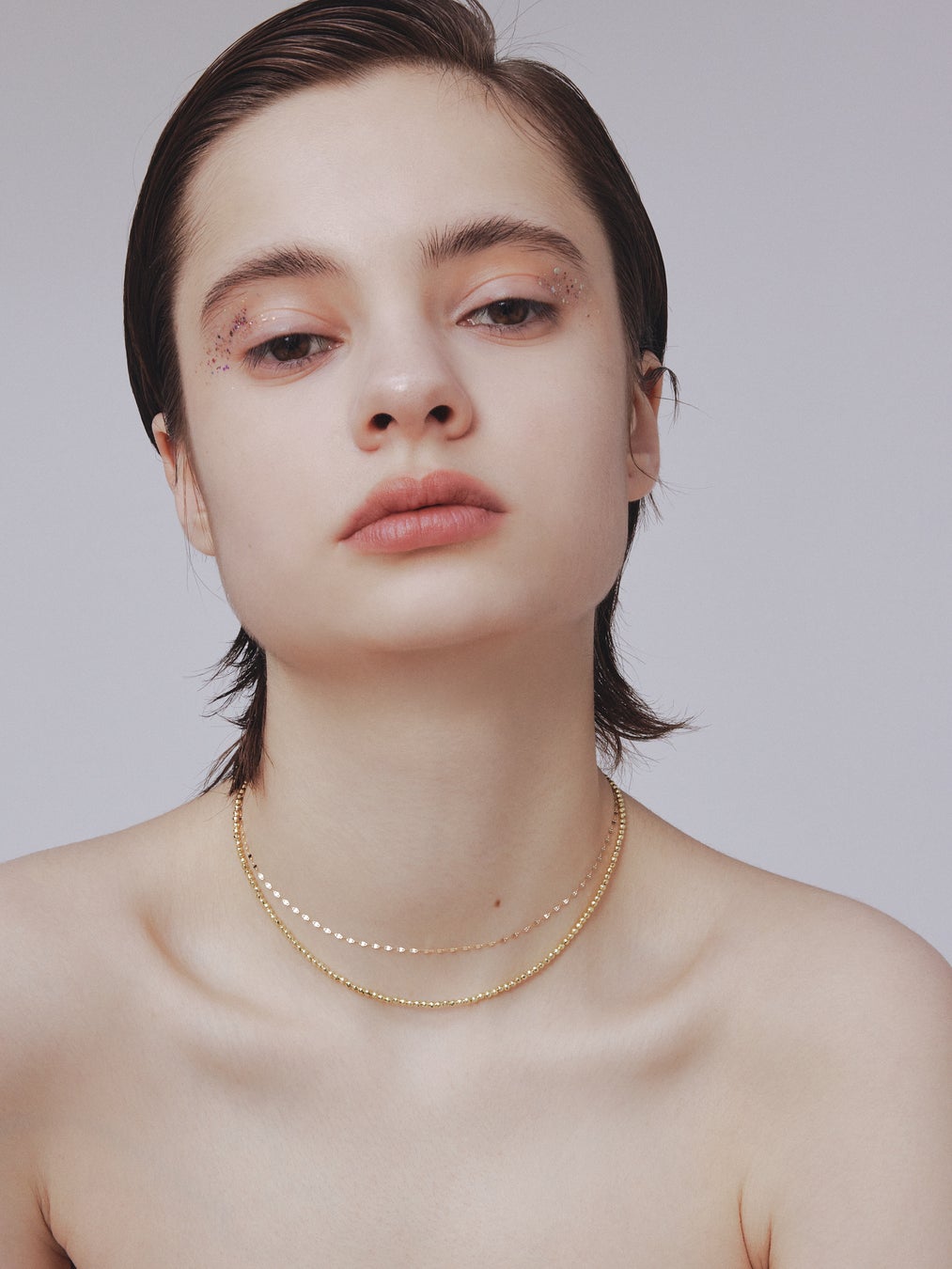 マットなメタリックゴールドにはイエローゴールドの美しい質感をレイヤードすることで生まれる意志の強い煌めきが 首元に宿ります