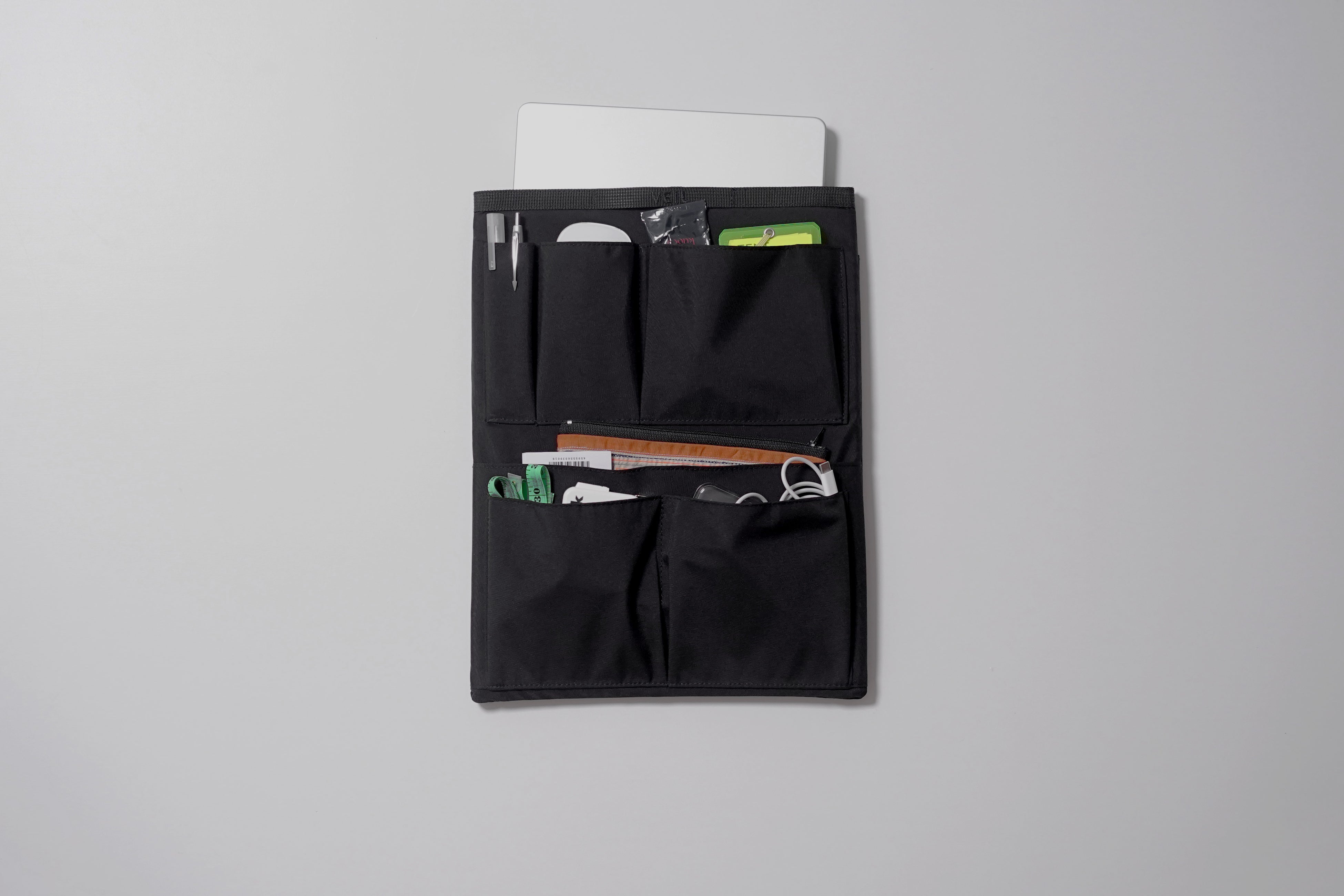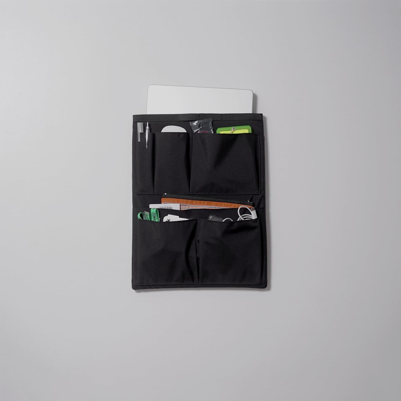 クッション材入りのインナーバッグは、ノートPCなどの機器をしっかり保護。内部には複数の仕切りポケットを備え、小物の整理にも対応します。さらに、バッグ全体の形状を支える芯材としての役割も担います。