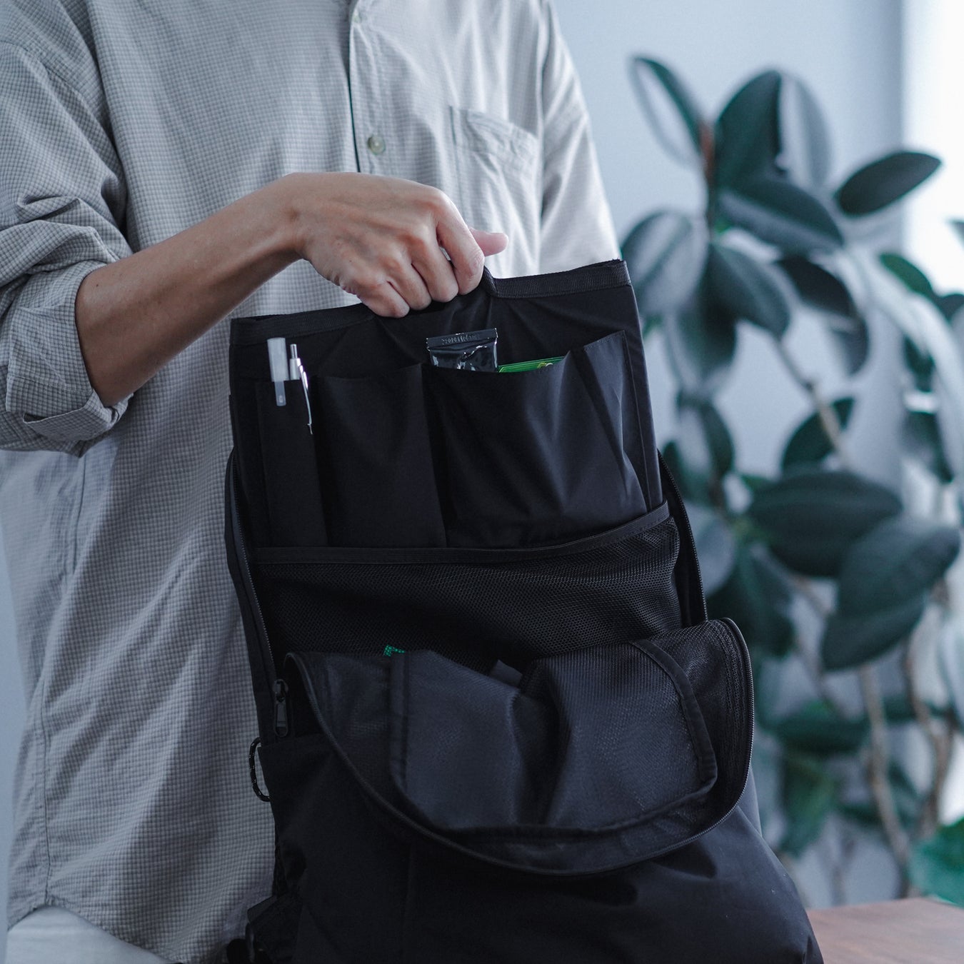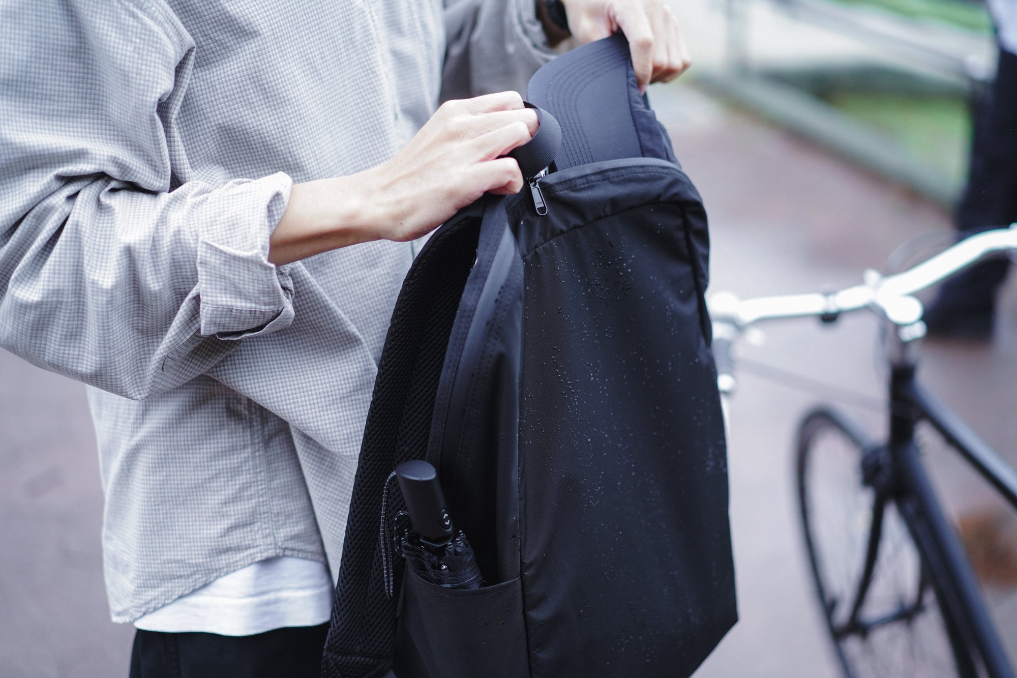 機能ごとに役割を分けた分離構造により、リュック全体が軽く、取り回しやすい仕上がりに。アウターバッグ側面のループ紐を使い、自由に小物やポーチなど取り付ければ自分好みにカスタマイズが可能。雨の日も、晴れの日も。清潔に、快適に、出かけられるリュックです。