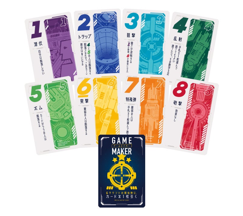 『クイックショット!』は全4ラウンドの戦いで生き残り、最強を目指す「シューティング・カードゲーム」です。各自は5枚の手札から、1ラウンドに1枚ずつウラ向きでカードを出し、同時にオモテ向きにして数字を比べます。カードには効果があり、他の人を脱落させたり、身を守ったりします。また、出したカードが他の人と被ると、効果が発動しません。