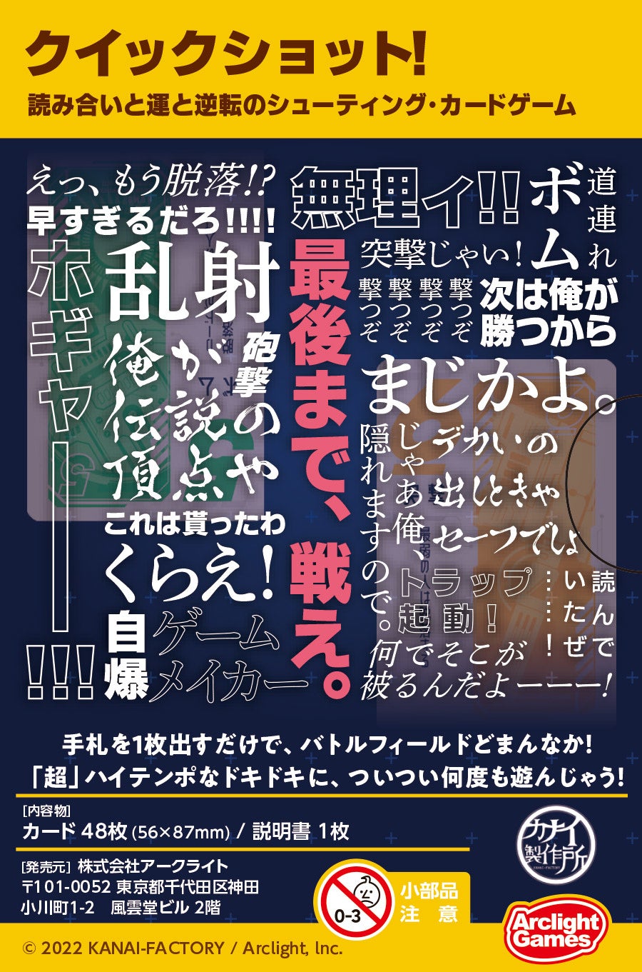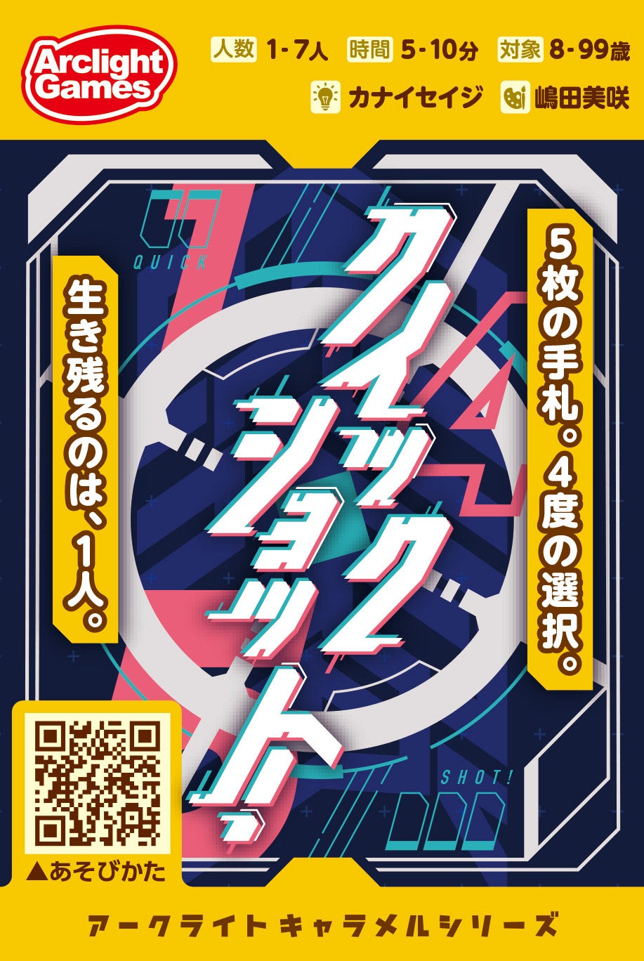 株式会社アークライト(本社:東京都千代田区)は、5分で遊べる、読み合いと運と逆転のシューティング・カードゲーム『クイックショット!』を2022年6月16日(木)より発売いたします。
